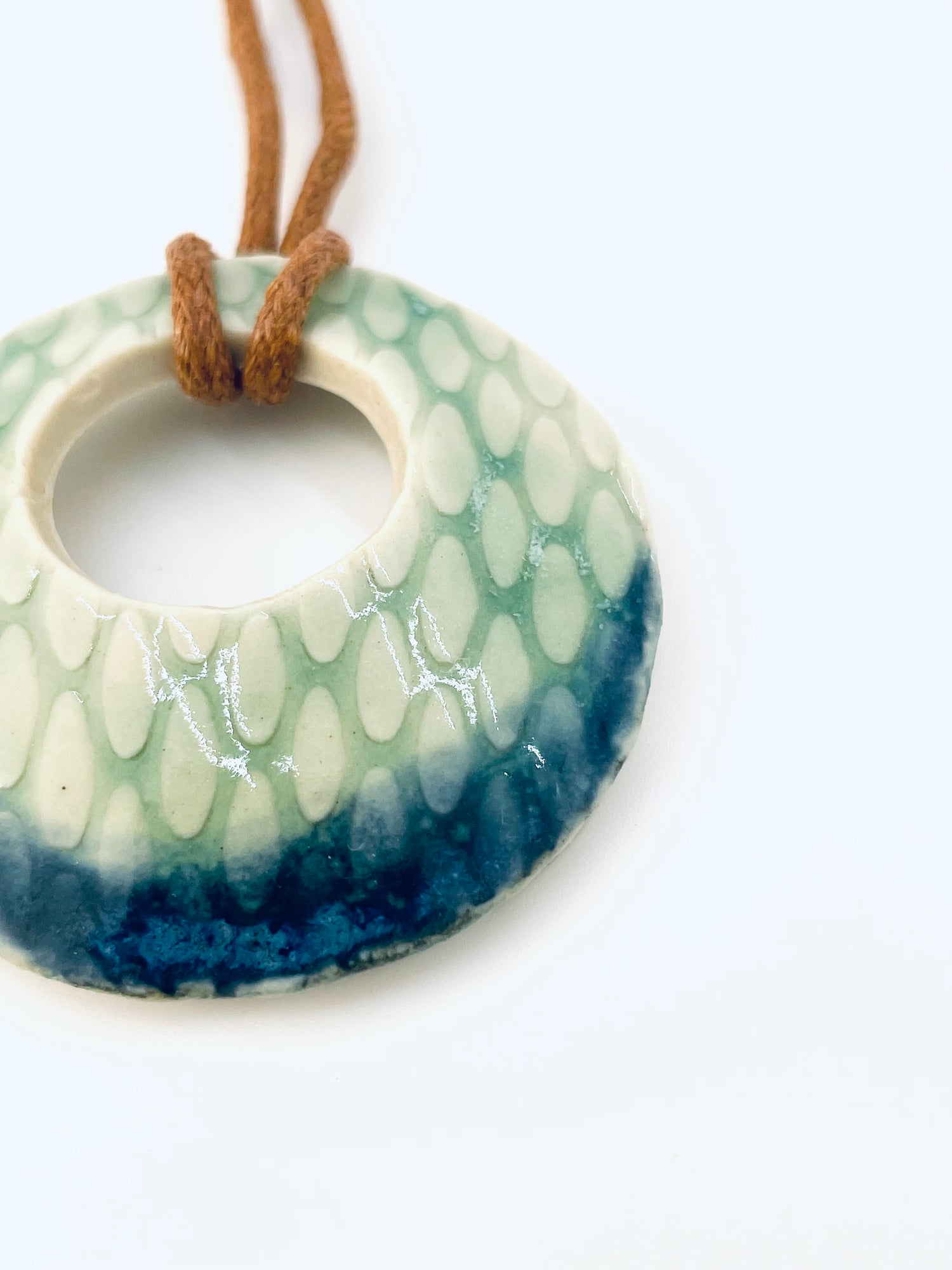 A striking geometric shape gets a natural style in this statement jewellery piece. An organic texture imprinted into the clay is highlighted by the soft seafoam green glaze edged with a deep marine blue.