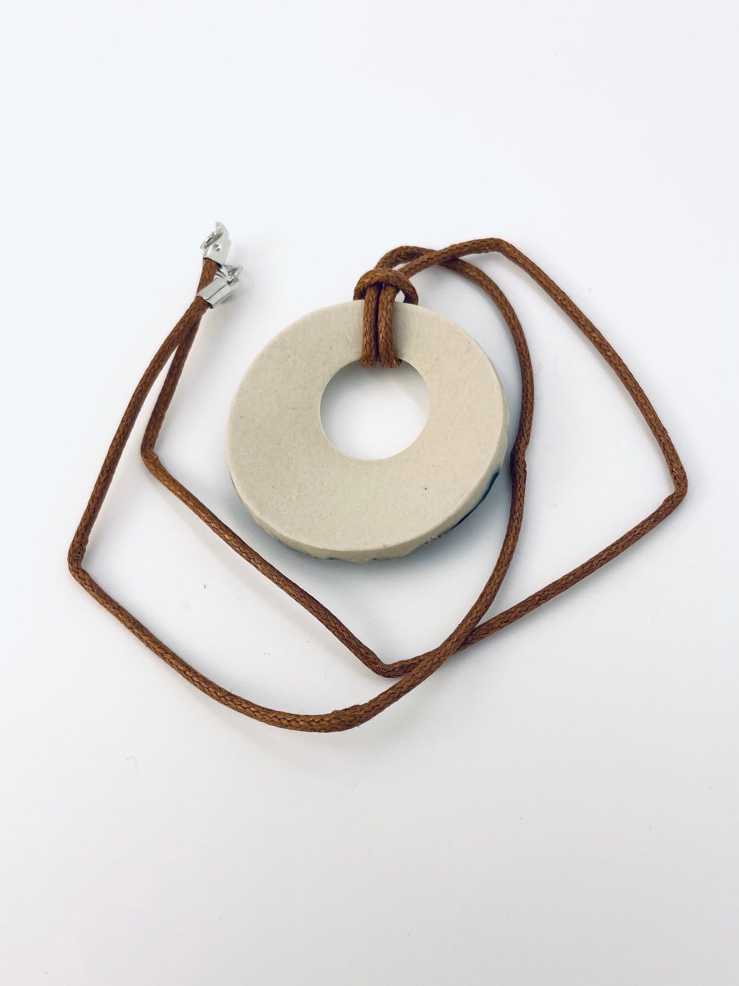 The necklace includes the two-inch-wide stoneware pendant on a waxed cotton cord approximately 20 inches in length with a stainless steel lobster clasp. As the pendants are handmade, each is unique; expect individual variations.