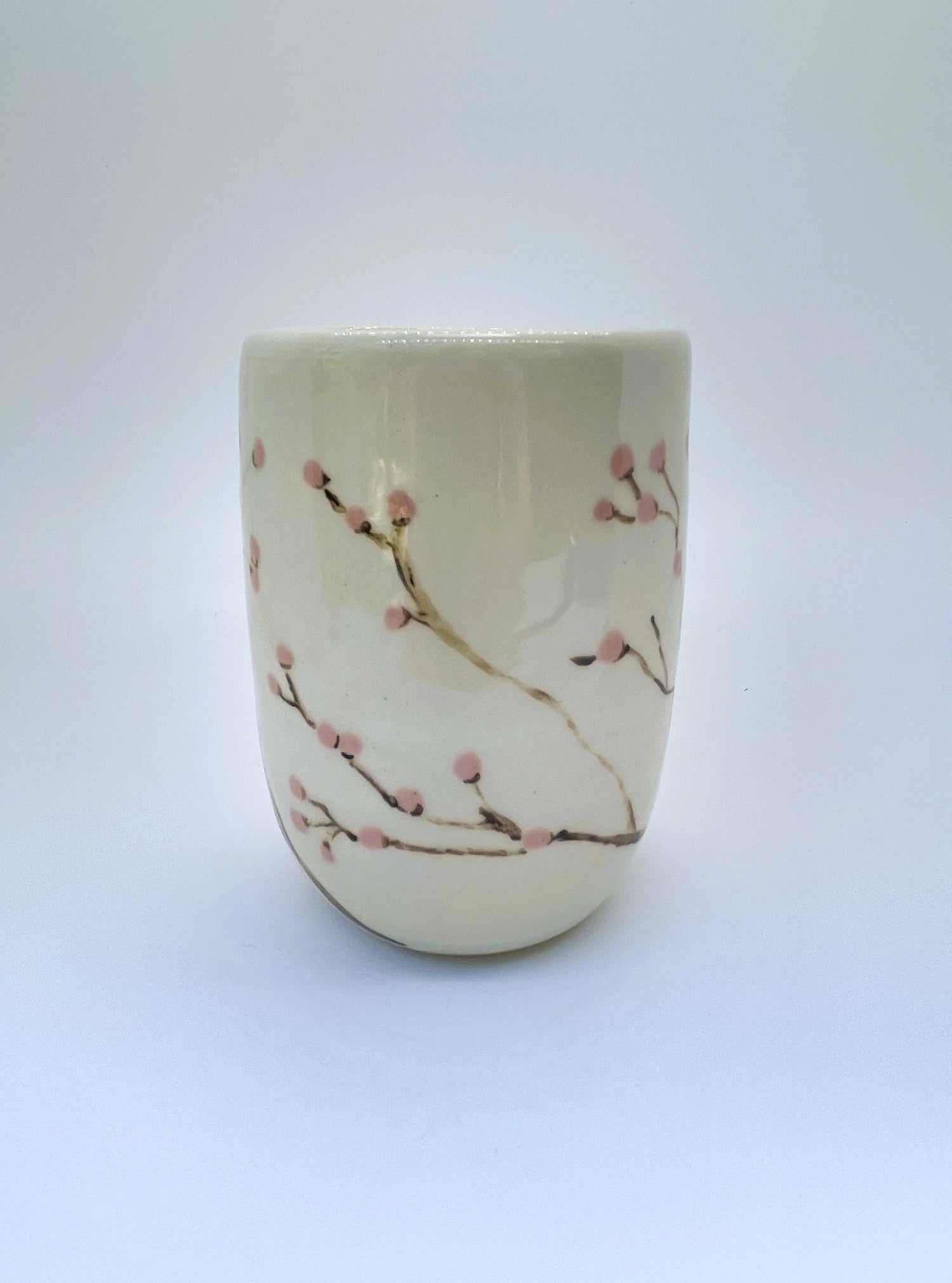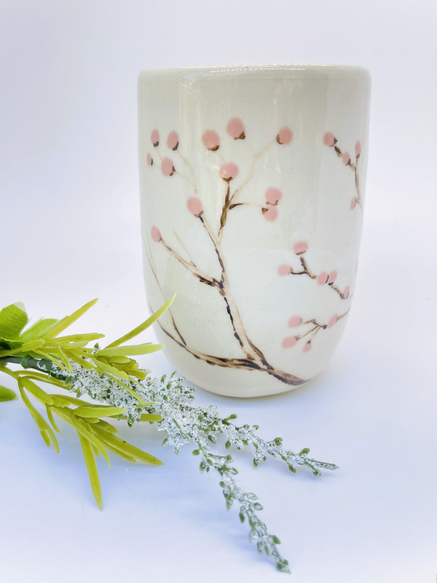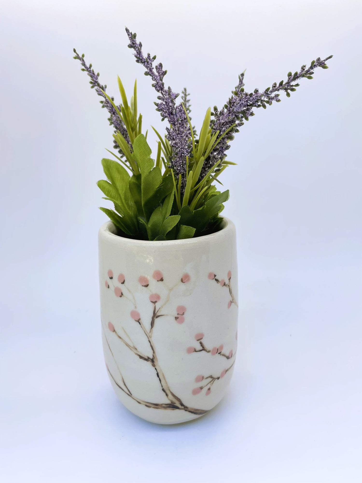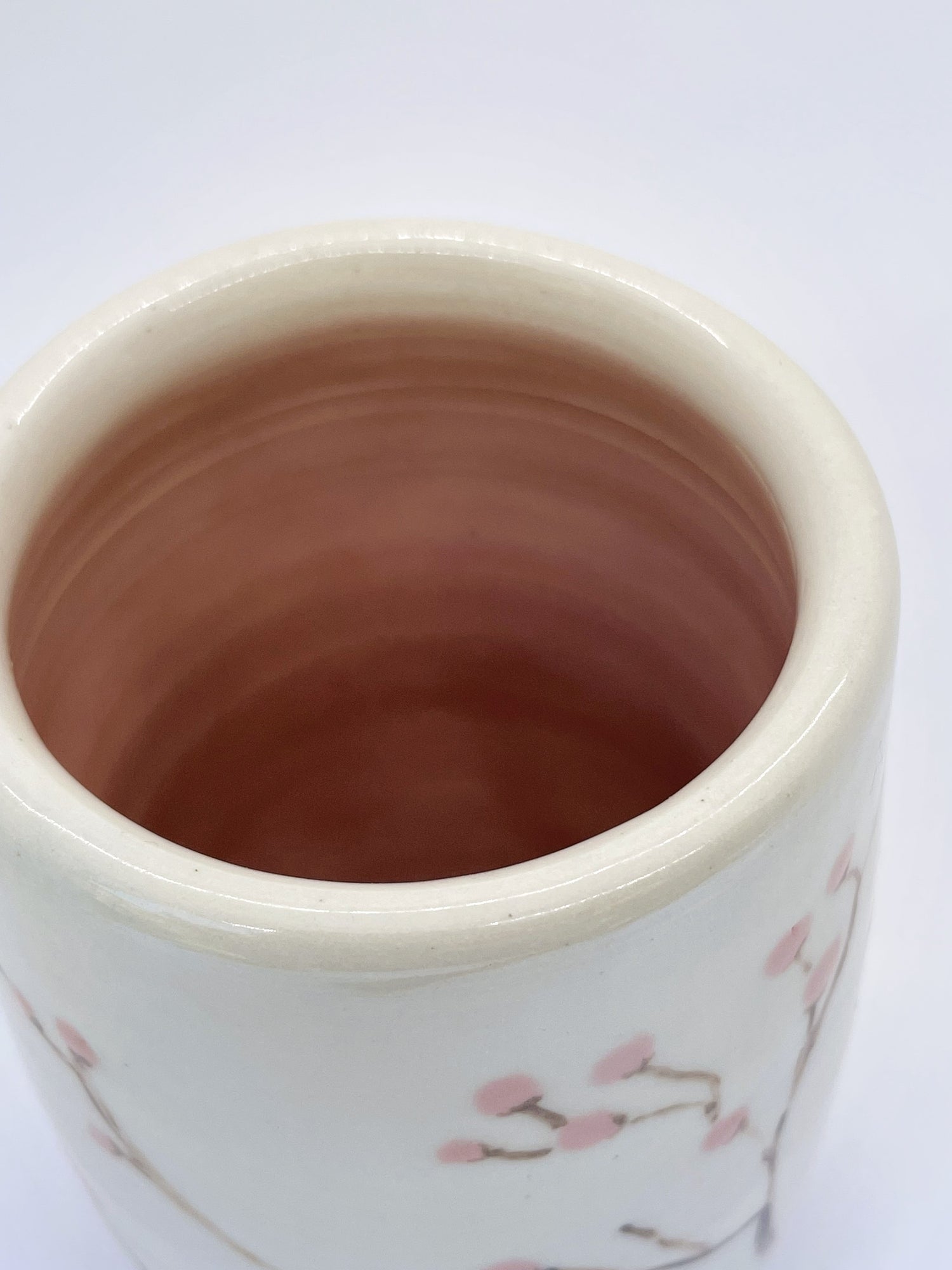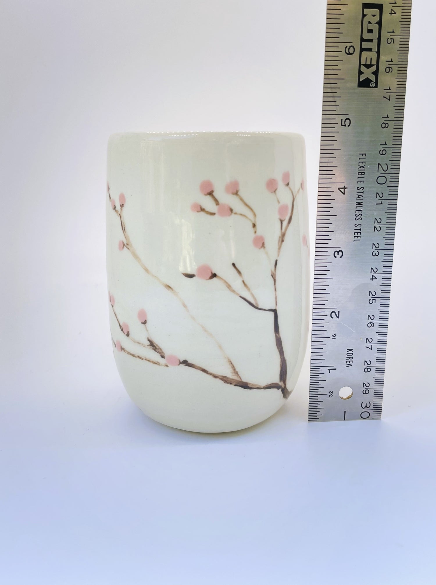 I threw this ceramic vase on the wheel in durable stoneware, and once it was bisque fired, I hand-painted petal-pink buds and brown stems in underglaze before firing it a second time to fuse the pattern to the vase. Finally, I hand-painted a translucent cherry-blossom- pink glaze inside, a nod to the colour explosion waiting to happen that each flower bud holds within it. It's ready for your favourite blooms!