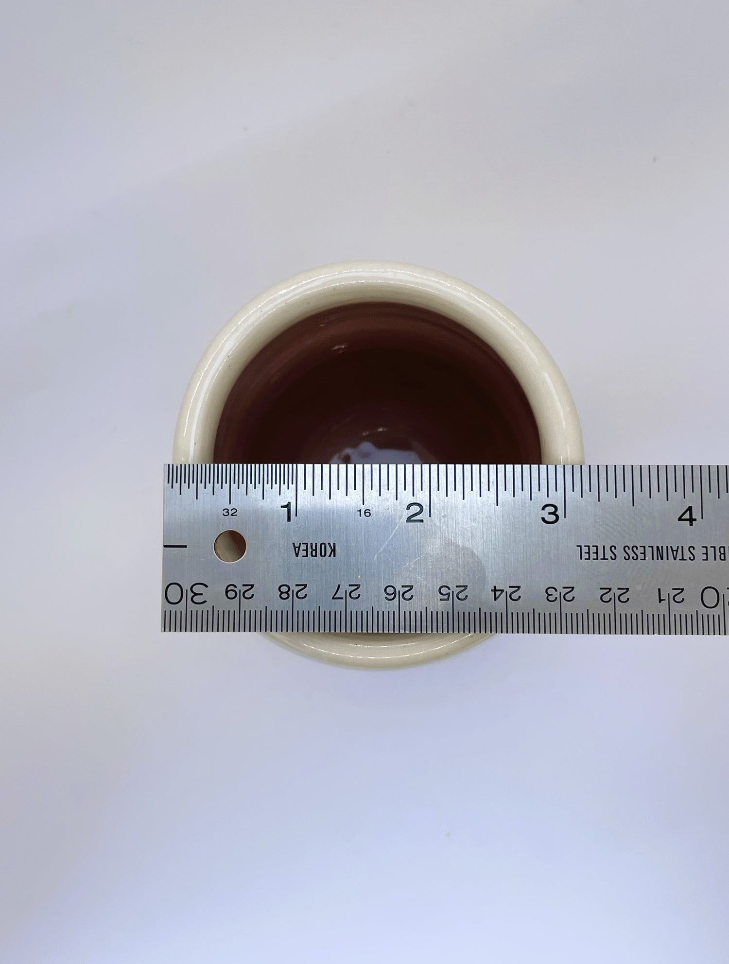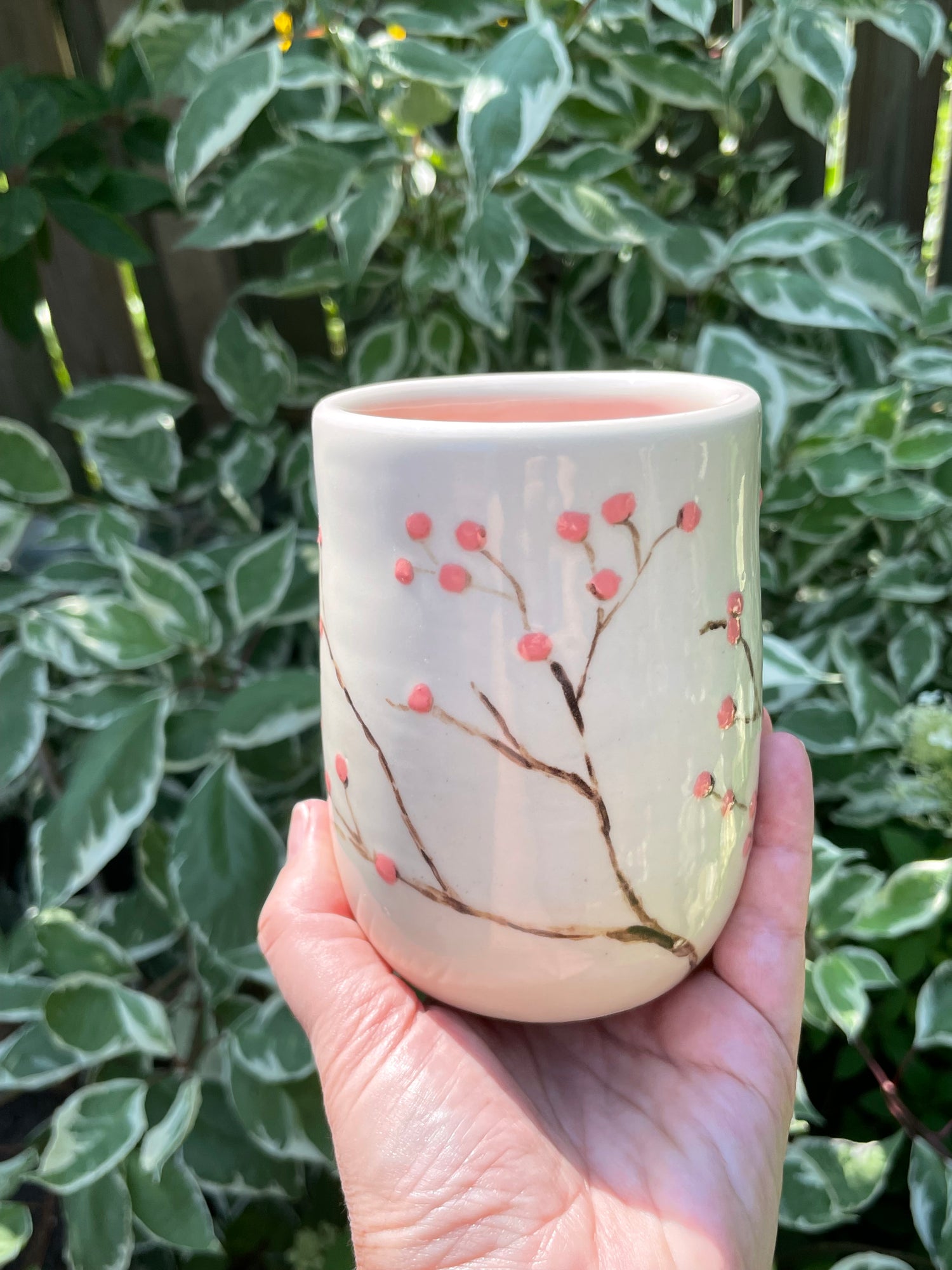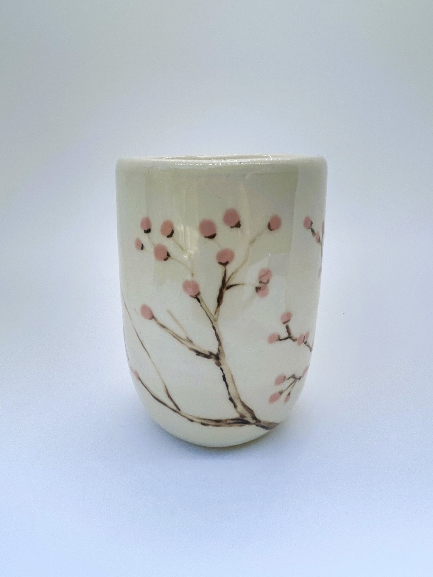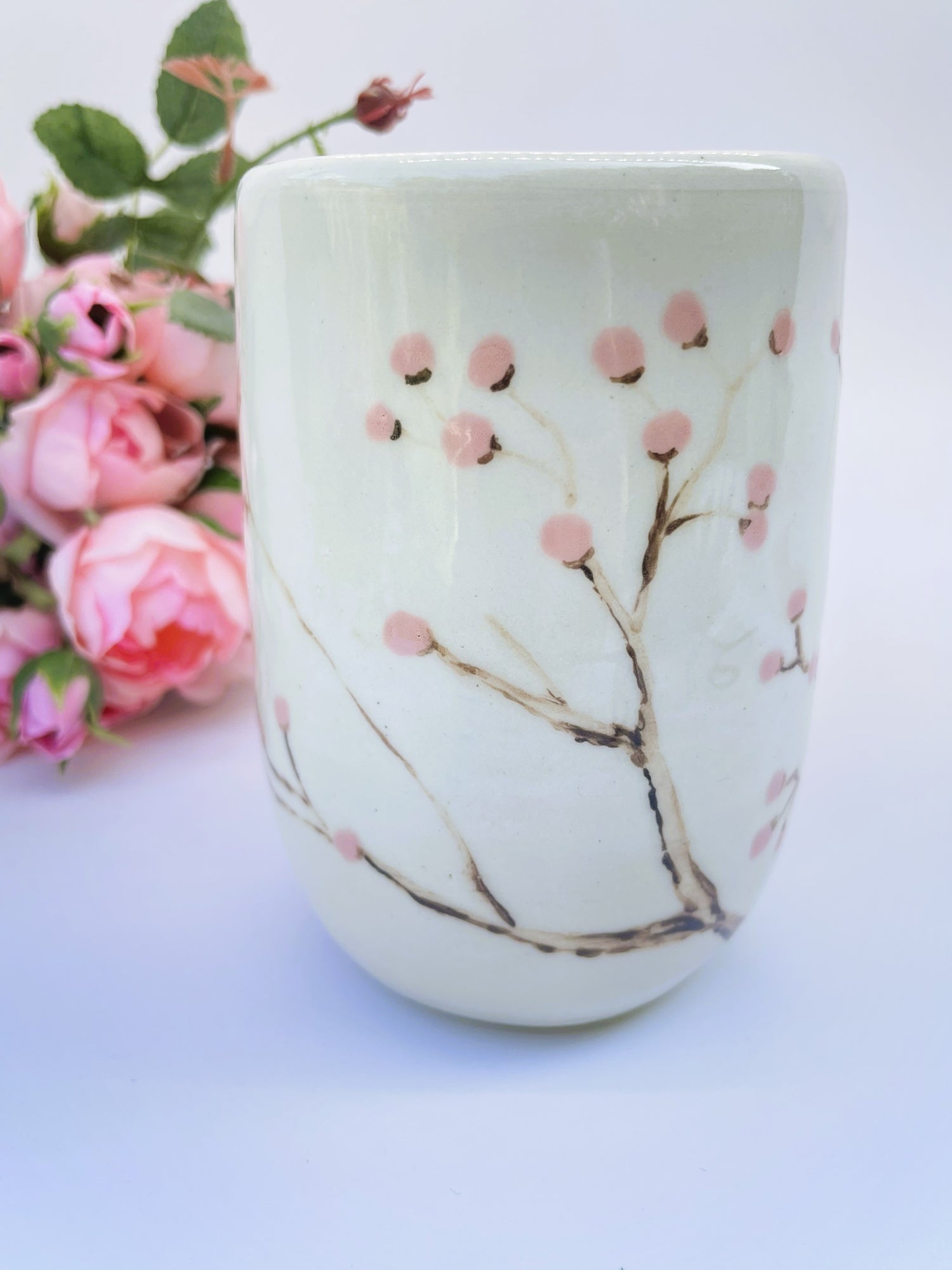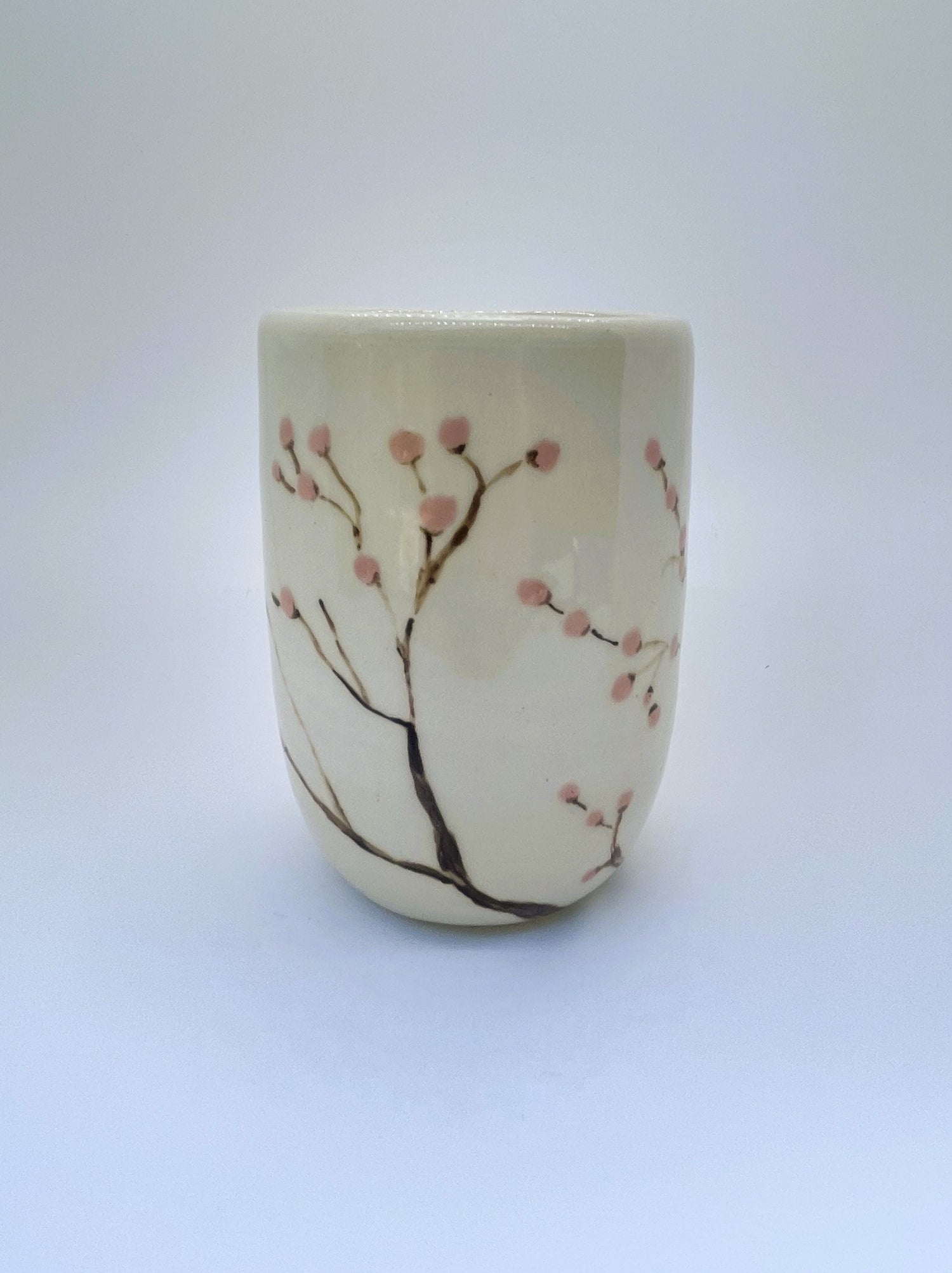 I threw this ceramic vase on the wheel in durable stoneware, and once it was bisque fired, I hand-painted petal-pink buds and brown stems in underglaze before firing it a second time to fuse the pattern to the vase. Finally, I hand-painted a translucent cherry-blossom- pink glaze inside, a nod to the colour explosion waiting to happen that each flower bud holds within it. It's ready for your favourite blooms!