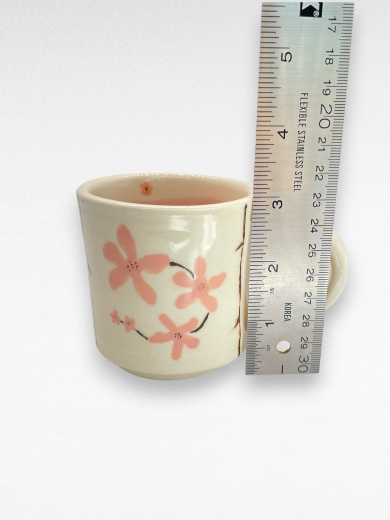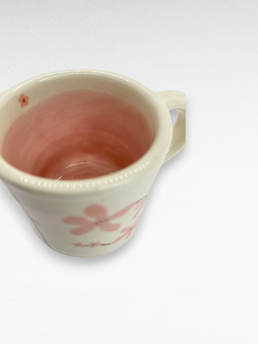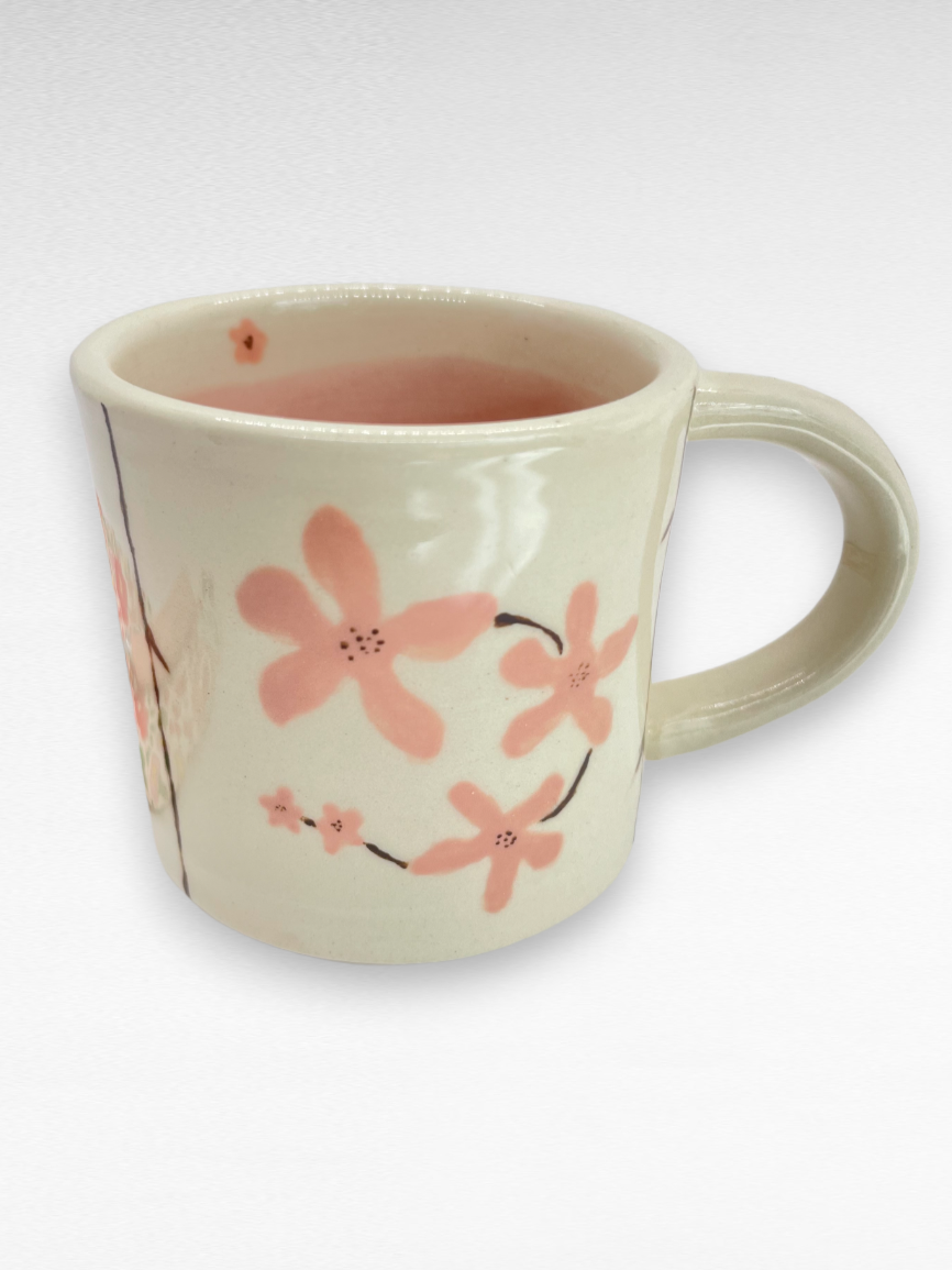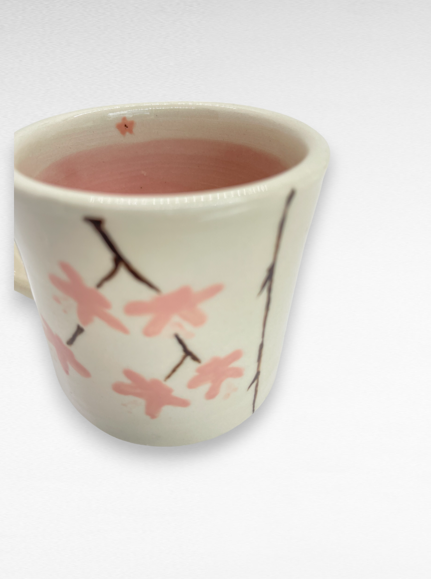 For this one-of-a-kind mug, IÂ hand painted the bisque-fired mug with pink sakura blossoms on each side, and added a translucent petal pink glaze to the inside. The entire mug then got dipped in a clear glaze that adds gloss and durability. This mug holds 5 oz.