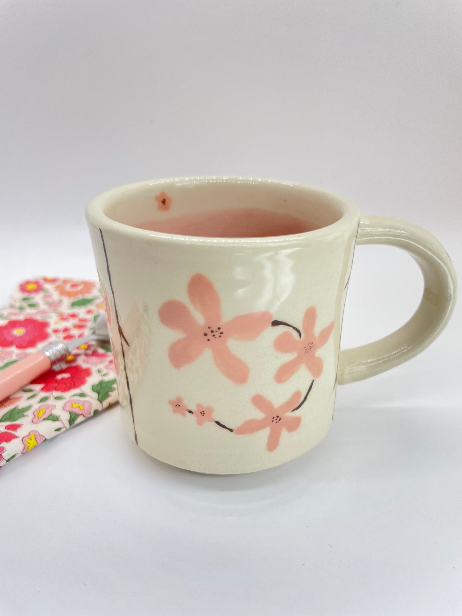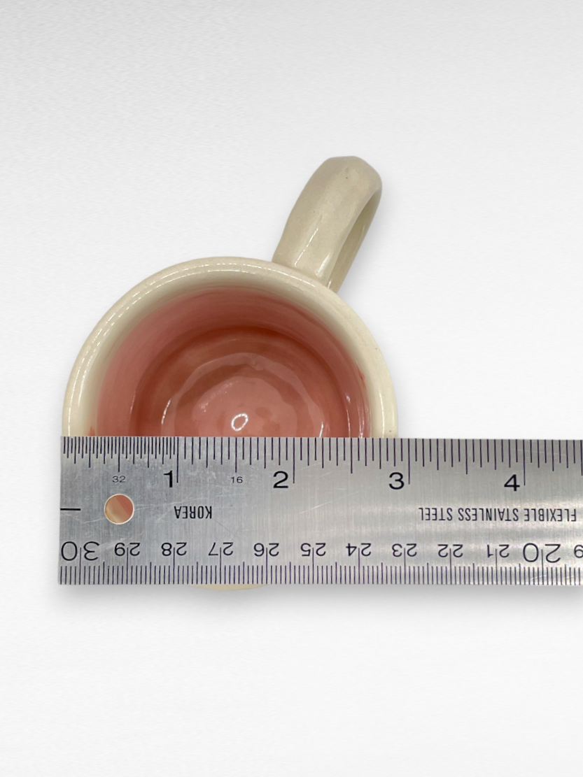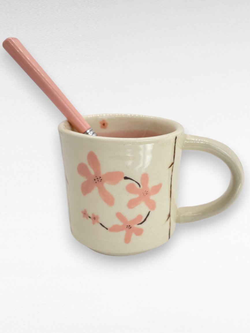 For this one-of-a-kind mug, IÂ hand painted the bisque-fired mug with pink sakura blossoms on each side, and added a translucent petal pink glaze to the inside. The entire mug then got dipped in a clear glaze that adds gloss and durability. This mug holds 5 oz.