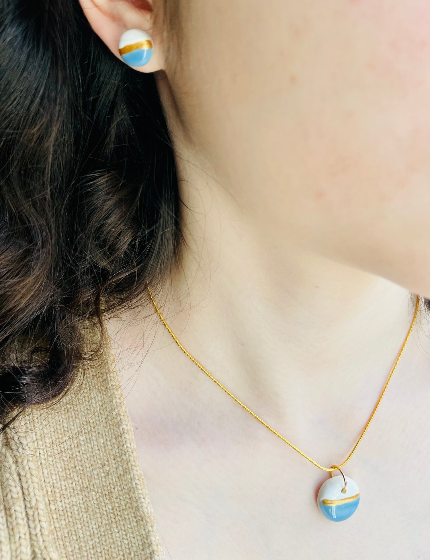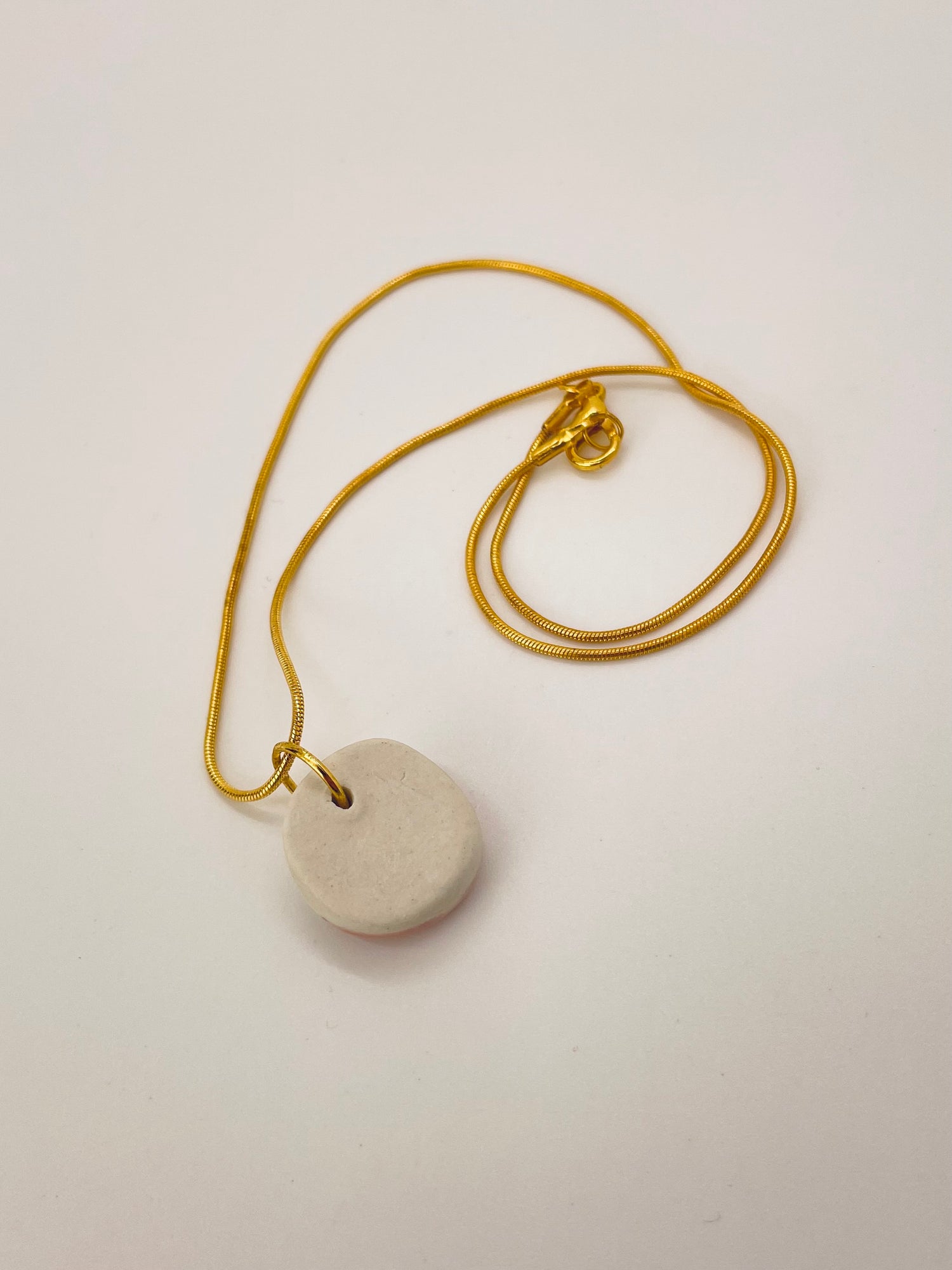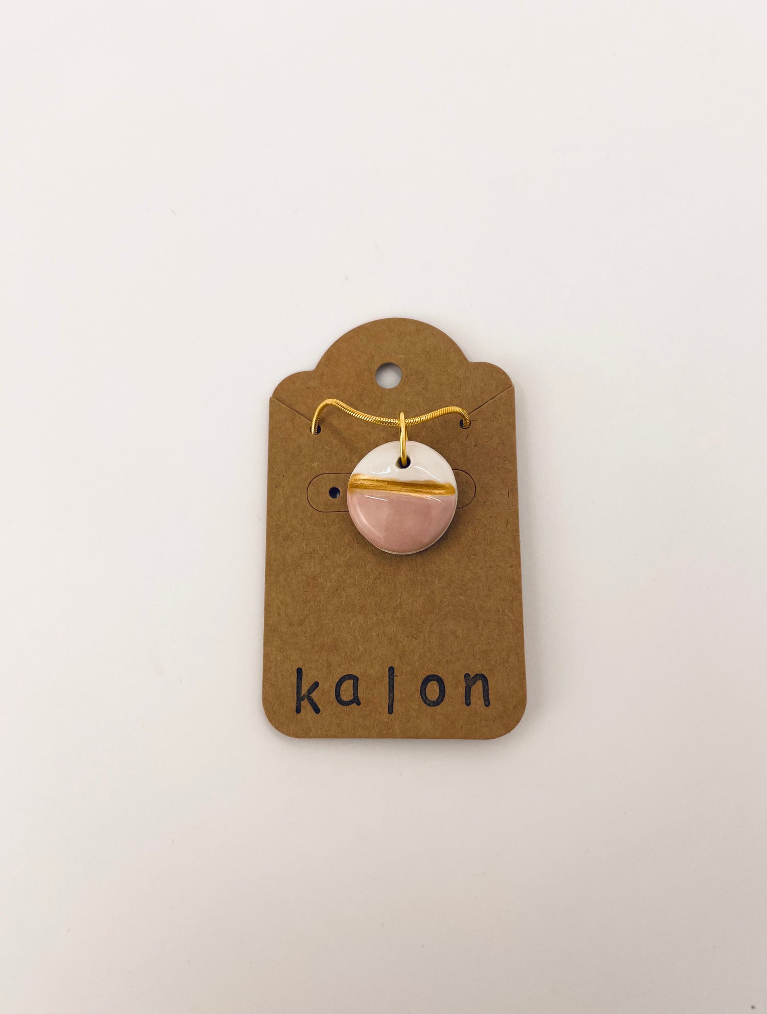 This mid-tone blush-pink glaze exudes warmth and softness without losing saturation, while a thin band of gold-toned porcelain paint adds a modern touch. The necklace includes a 16-inch snake chain in a high-polish gold alloy with a lobster clasp. As the charms are handmade, each is unique; expect individual variations.