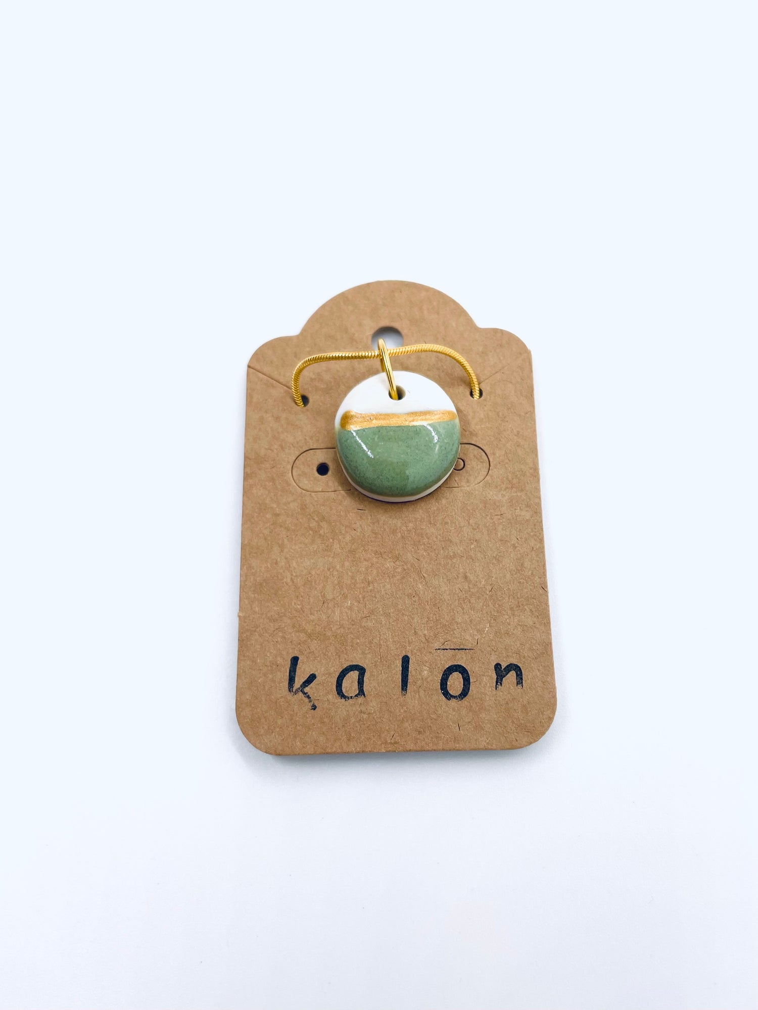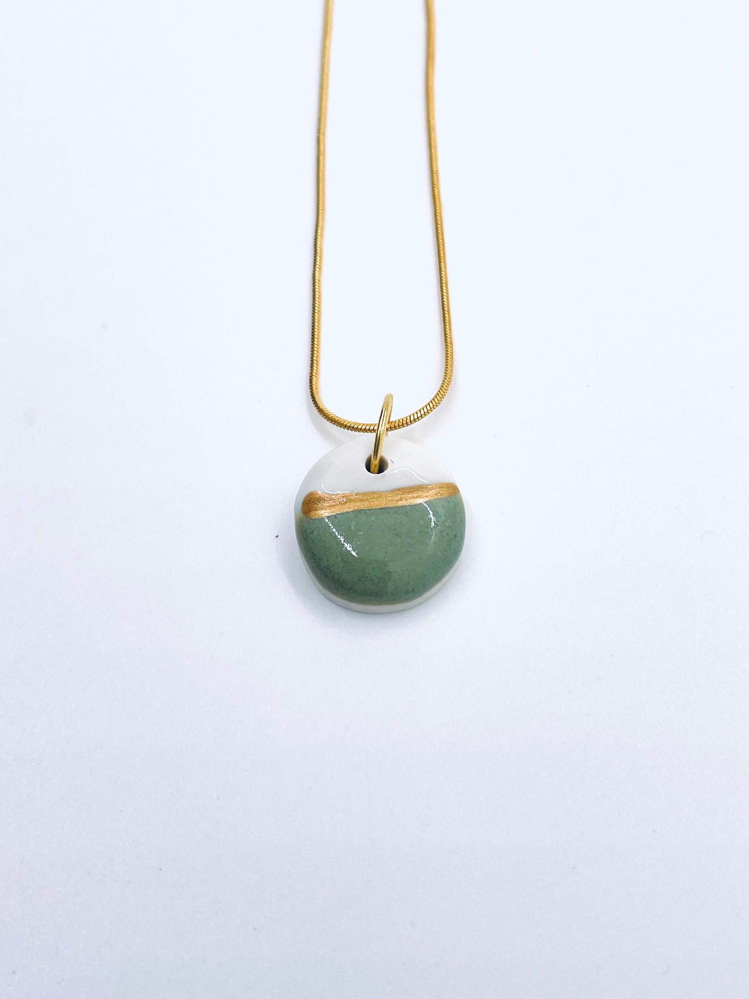 This jade-green glaze exudes warmth and softness without losing saturation, while a thin band of gold-toned porcelain paint adds a modern touch. The necklace includes a 16-inch snake chain in a high-polish gold alloy with a lobster clasp. As the charms are handmade, each is unique; expect individual variations.