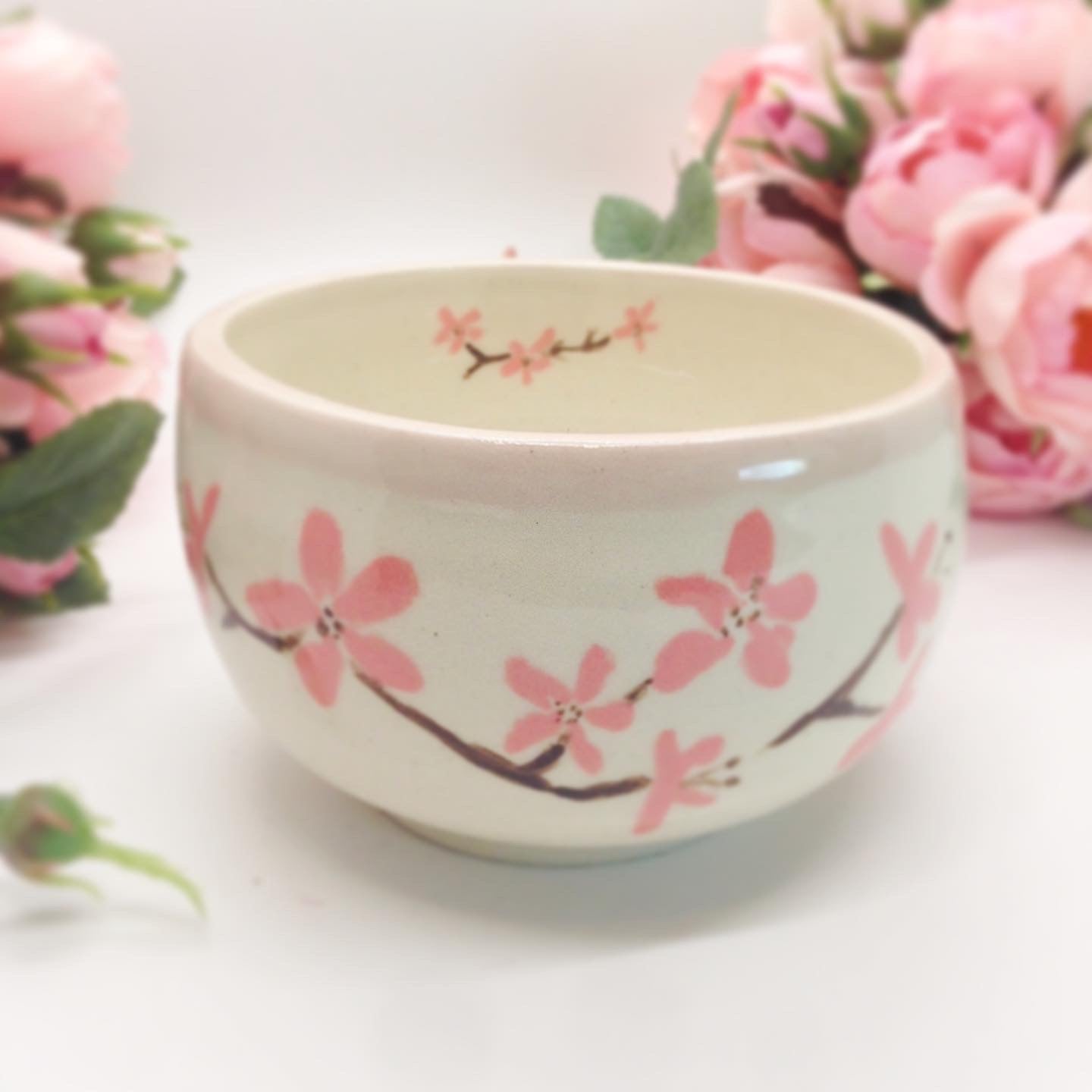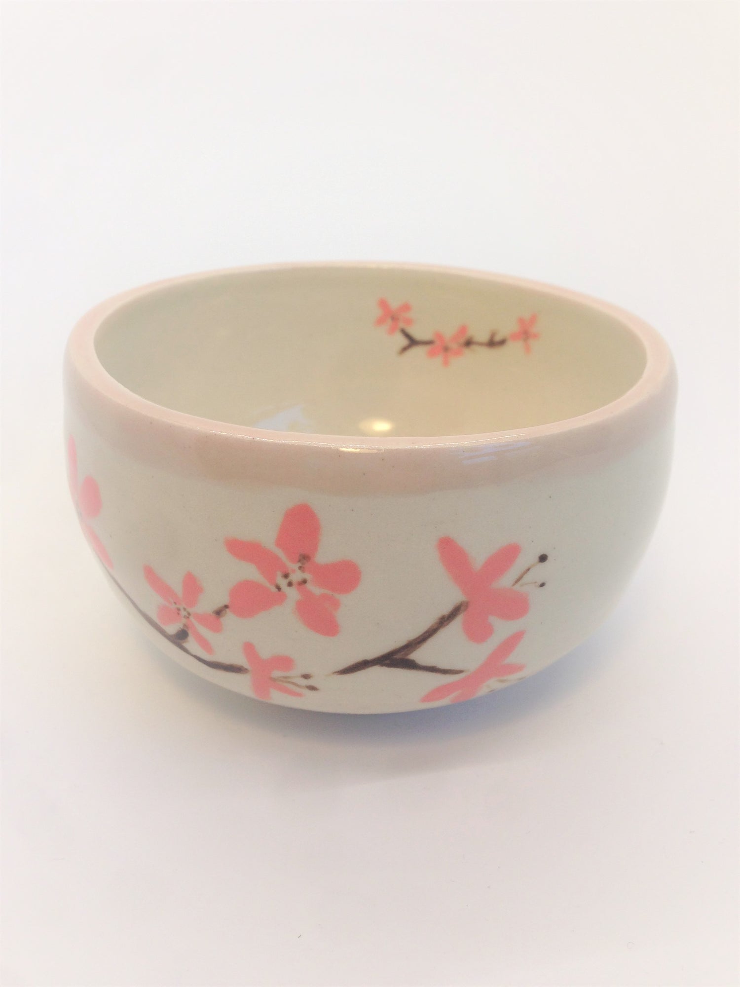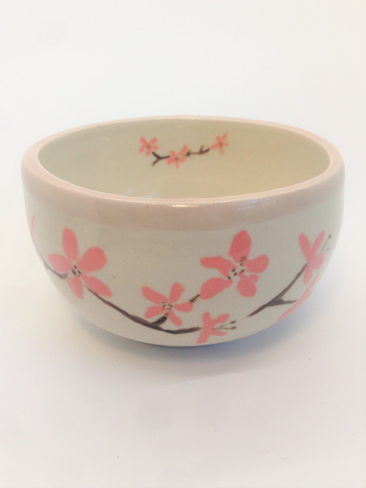 This bowl is thrown on the wheel then bisqued in an electric kiln. I painted a branch of cherry blossoms in underglazes on the face of it, and a small branch on the interior rim before firing the bowl a second time. A shiny clear glaze adds functionality and durability.