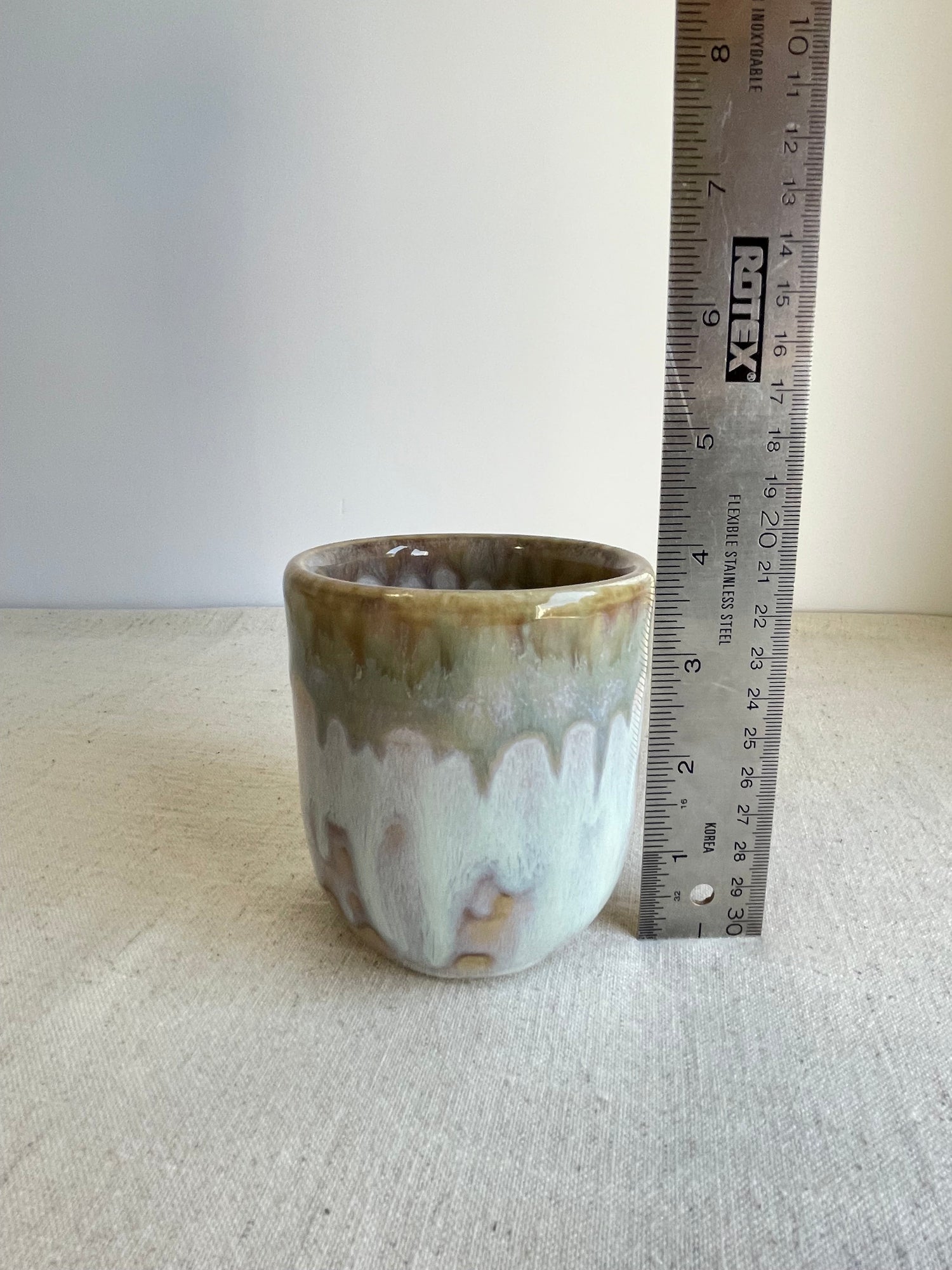 After I threw the cup on the wheel, I measured carefully to ensure the lip of the lid fit well into the cup, and the edge worked with the cup's width. After I bisque fired them, I hand-painted with runny reactive glazes which combined to create the variegated effect in their final firing.