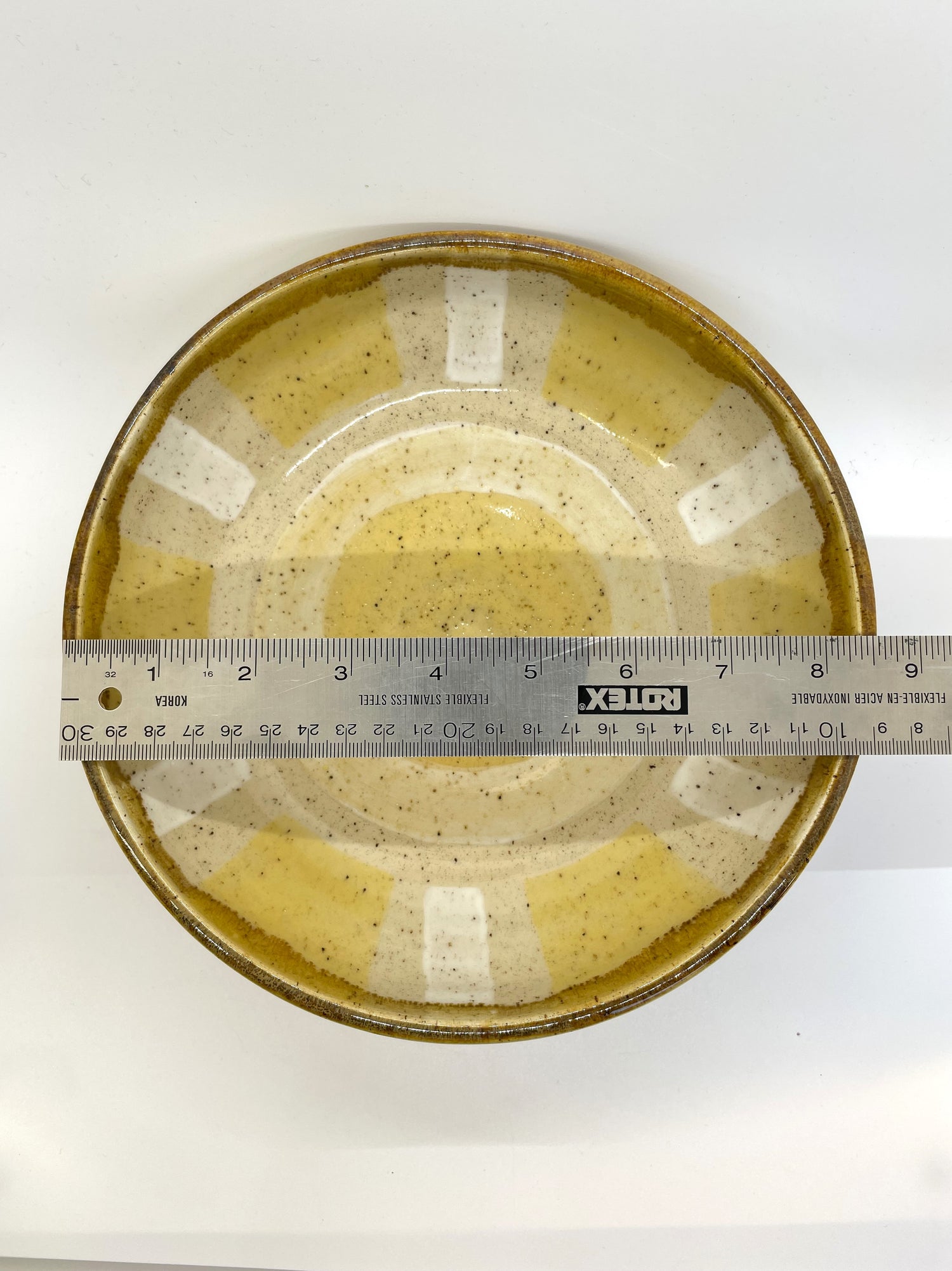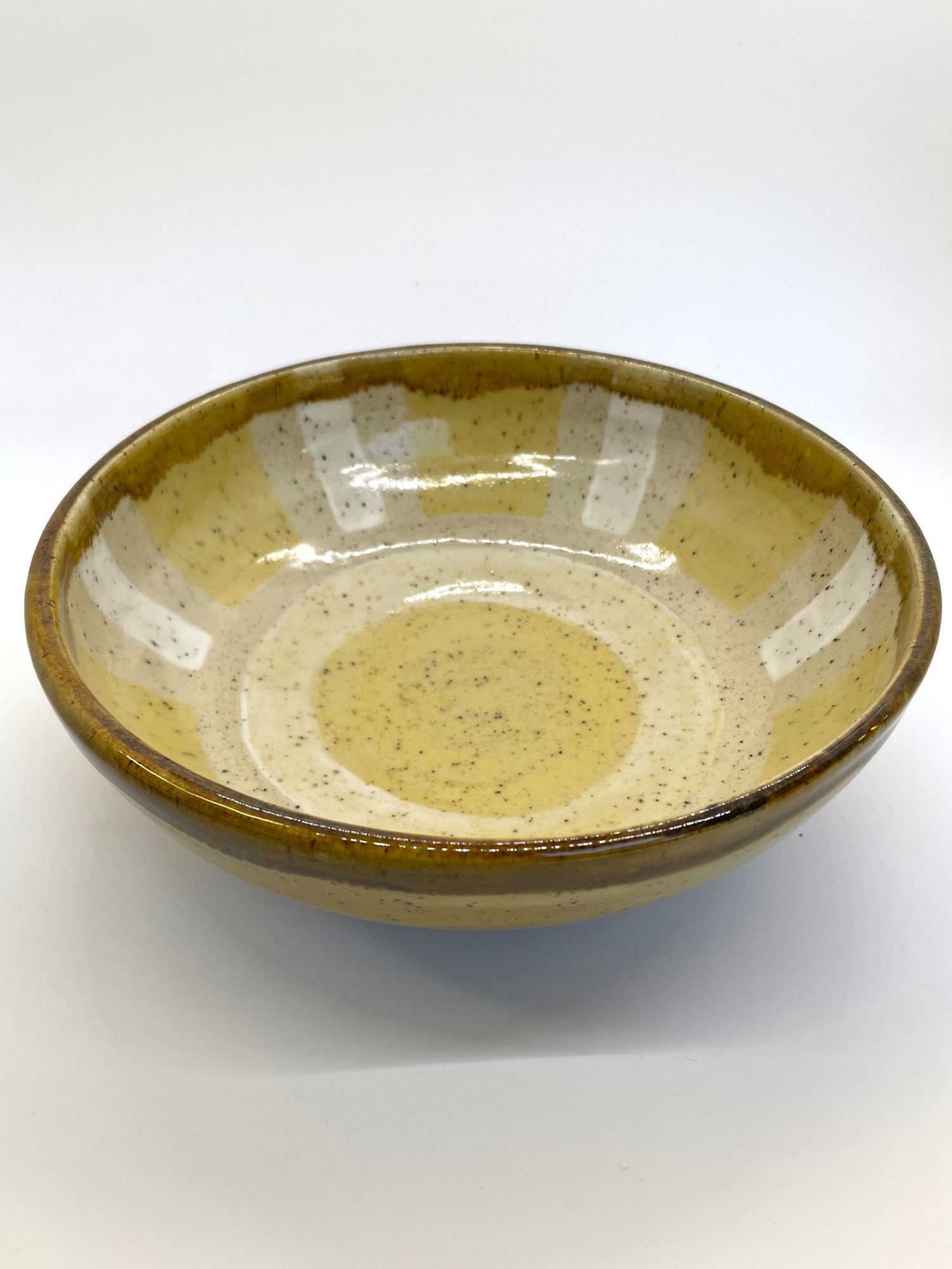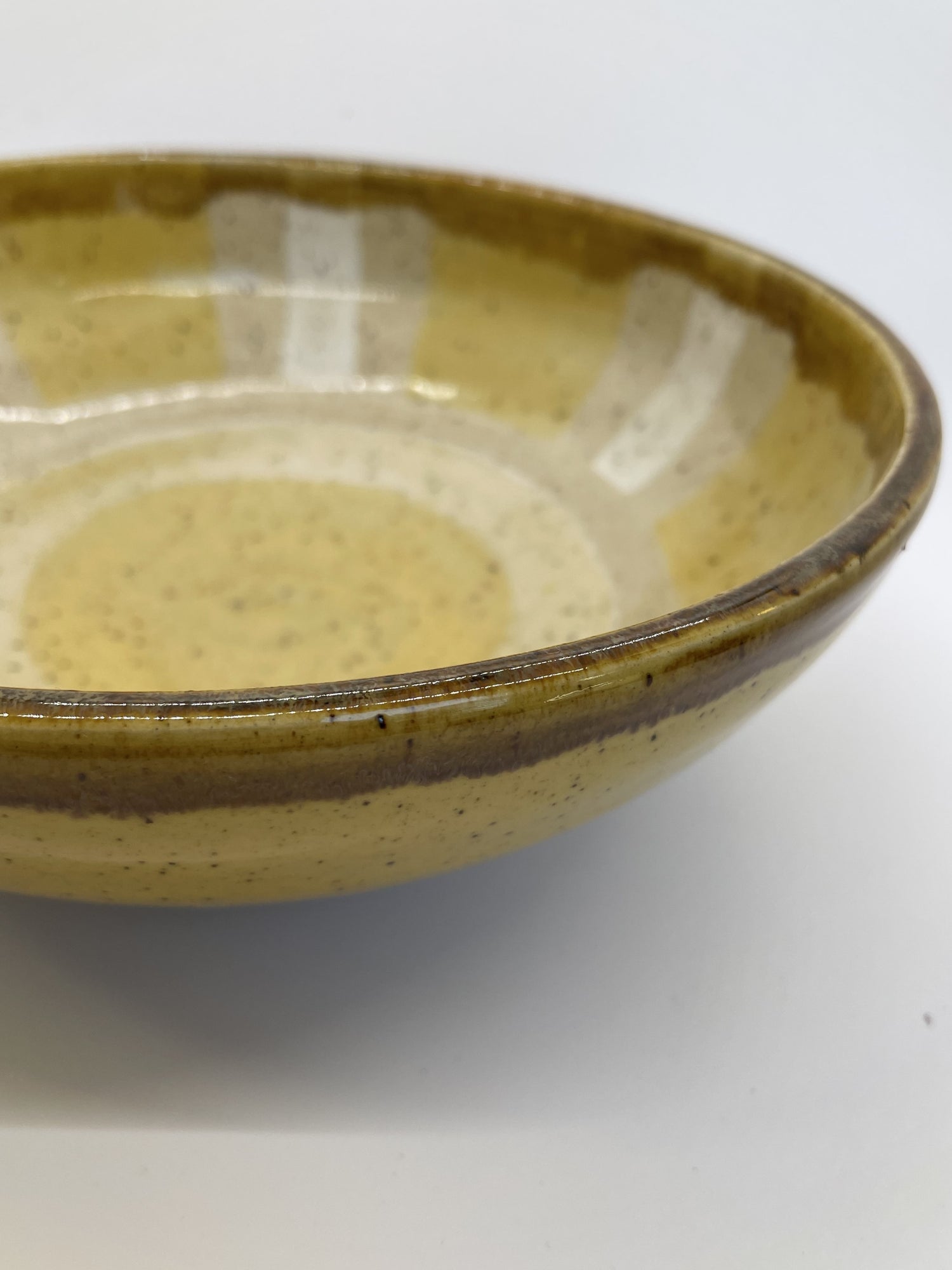 The cheery yellow tones of this bowl brighten any kitchen counter or dining table. Featuring bright rays reminiscent of sunshine and gently sloping sides, this ceramic bowl works well as a fruit bowl, salad bowl, pasta serving dish, hot side-dish serveware or beautiful bread basket. The speckled clay is highlighted by a warm brown glaze on the rim and the all-over shiny glaze ensures durability.Â