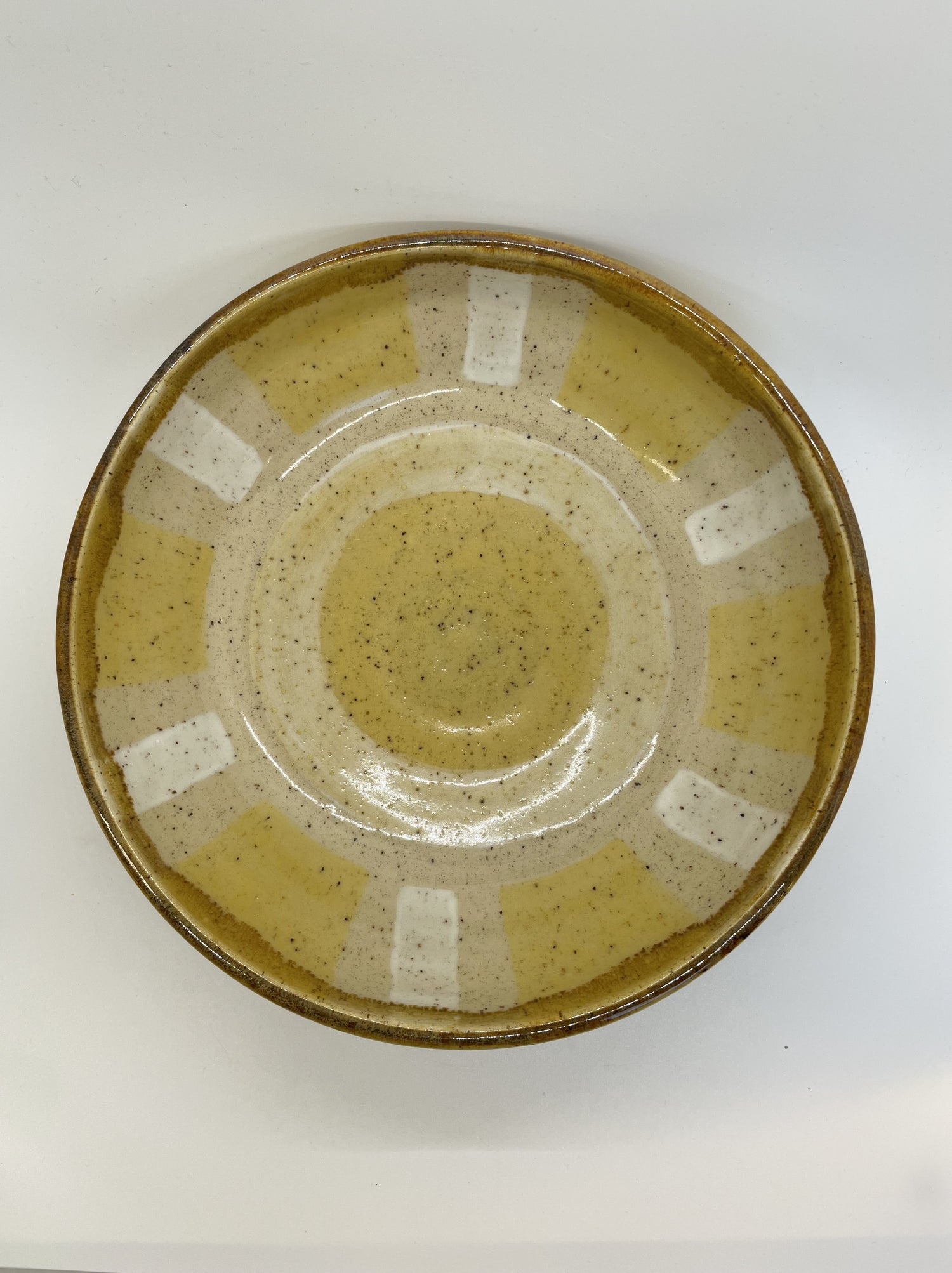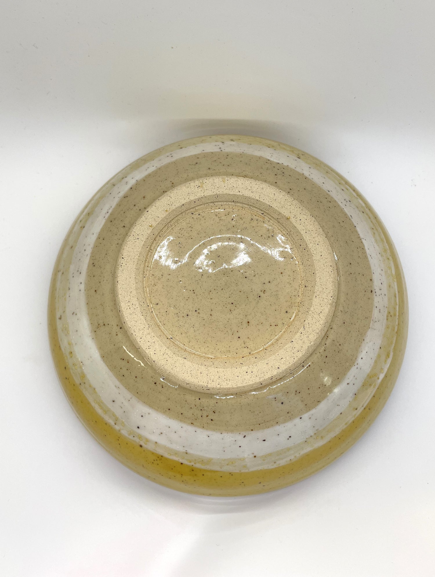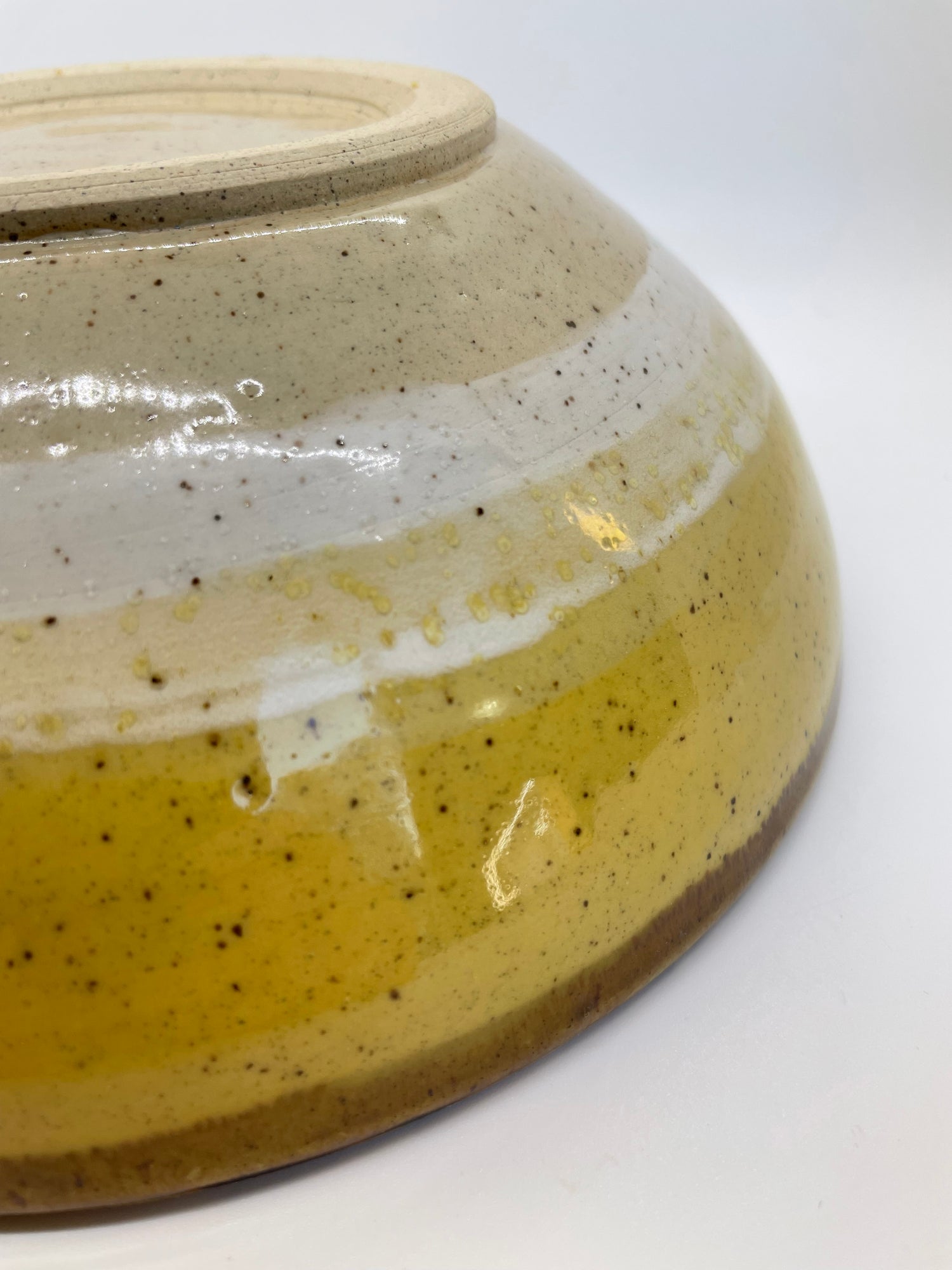 The cheery yellow tones of this bowl brighten any kitchen counter or dining table. Featuring bright rays reminiscent of sunshine and gently sloping sides, this ceramic bowl works well as a fruit bowl, salad bowl, pasta serving dish, hot side-dish serveware or beautiful bread basket. The speckled clay is highlighted by a warm brown glaze on the rim and the all-over shiny glaze ensures durability.Â