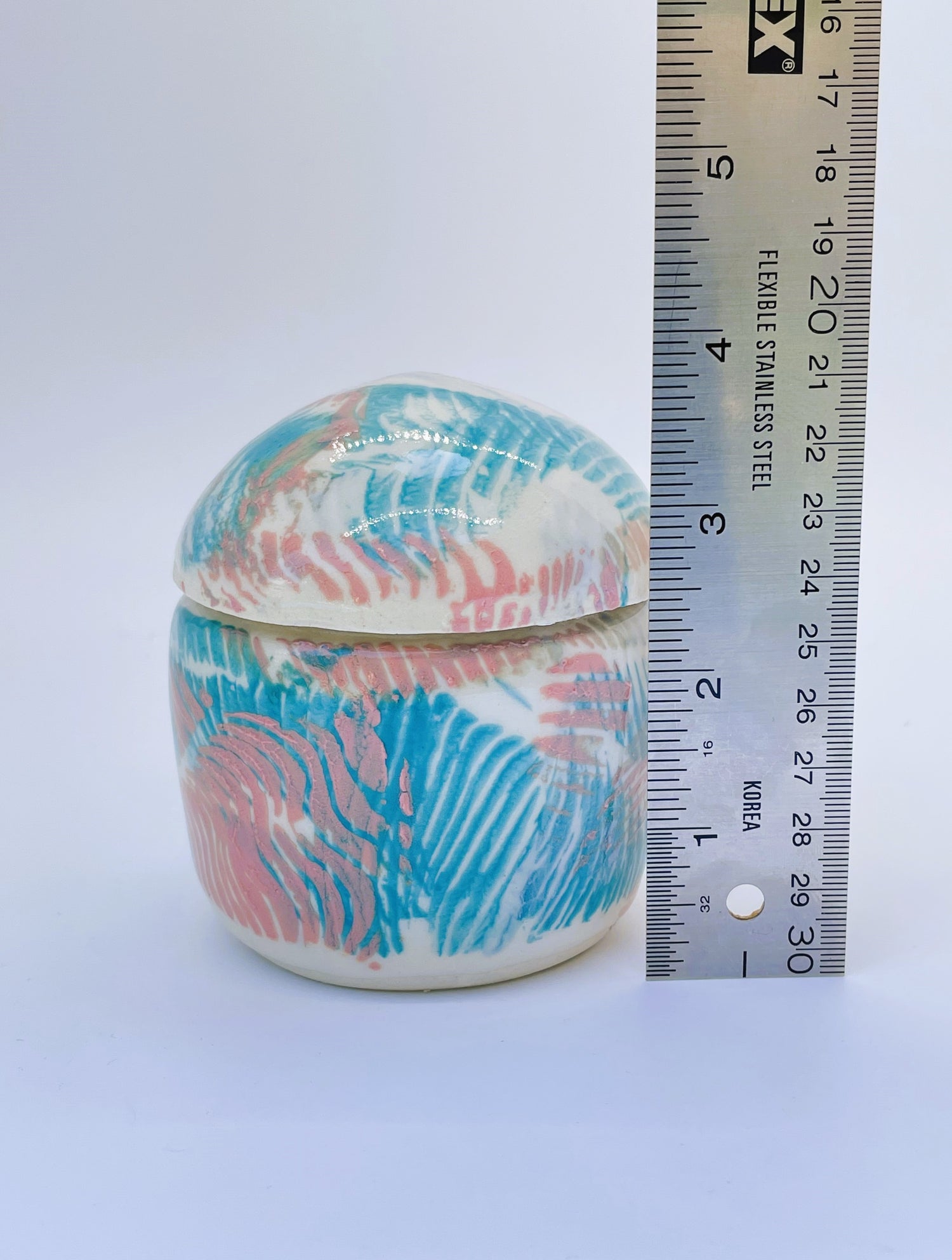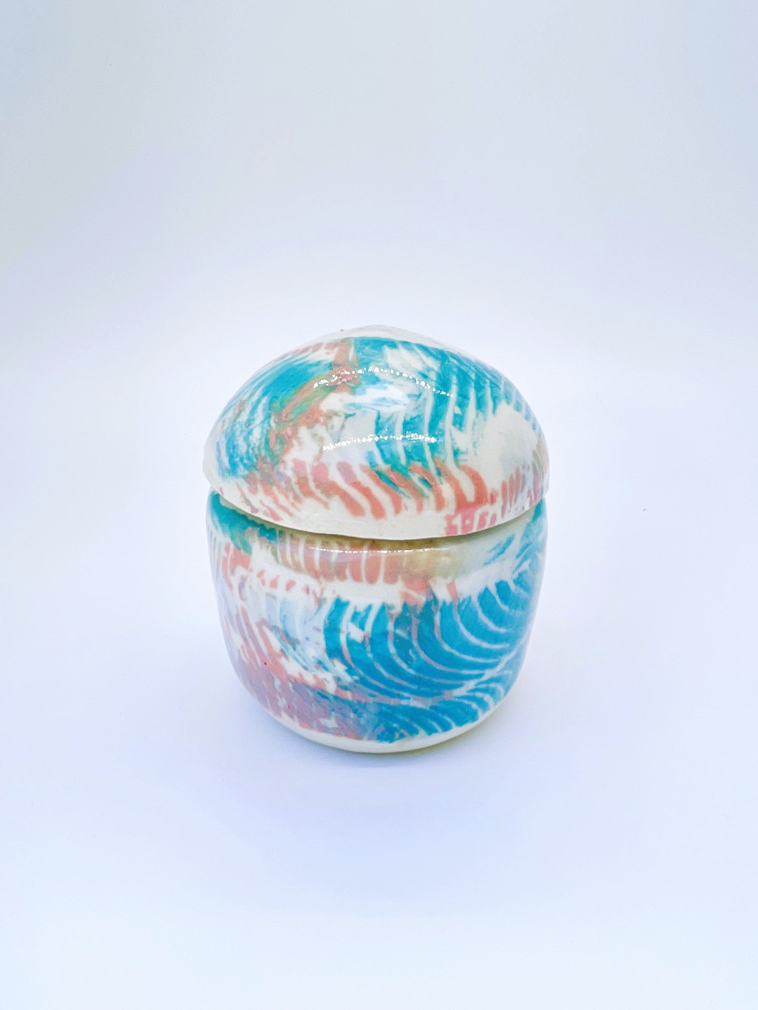I used stoneware clay to throw this vessel and lid on a potter’s wheel in one piece. Once the pot was more firm, I carefully indented the pot near the rounded top to form a gallery and cut the piece to create a lid. After firing, I used thickened underglazes with a gelli plate printing technique to decorate the surface. Finally, a clear glaze for the exterior adds a touch of gloss.Â