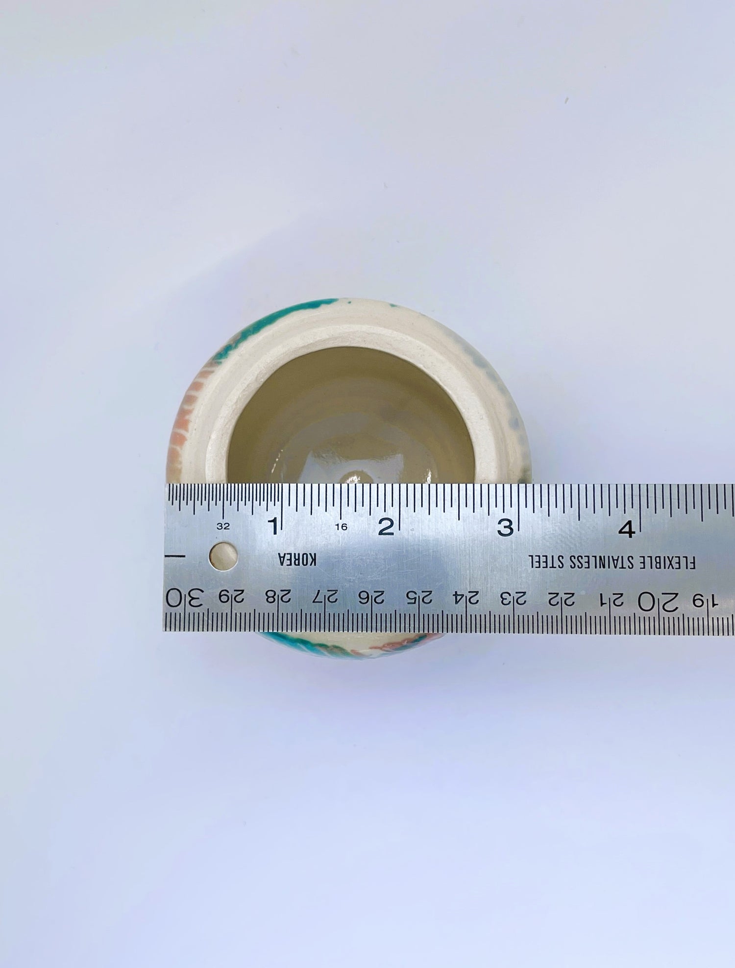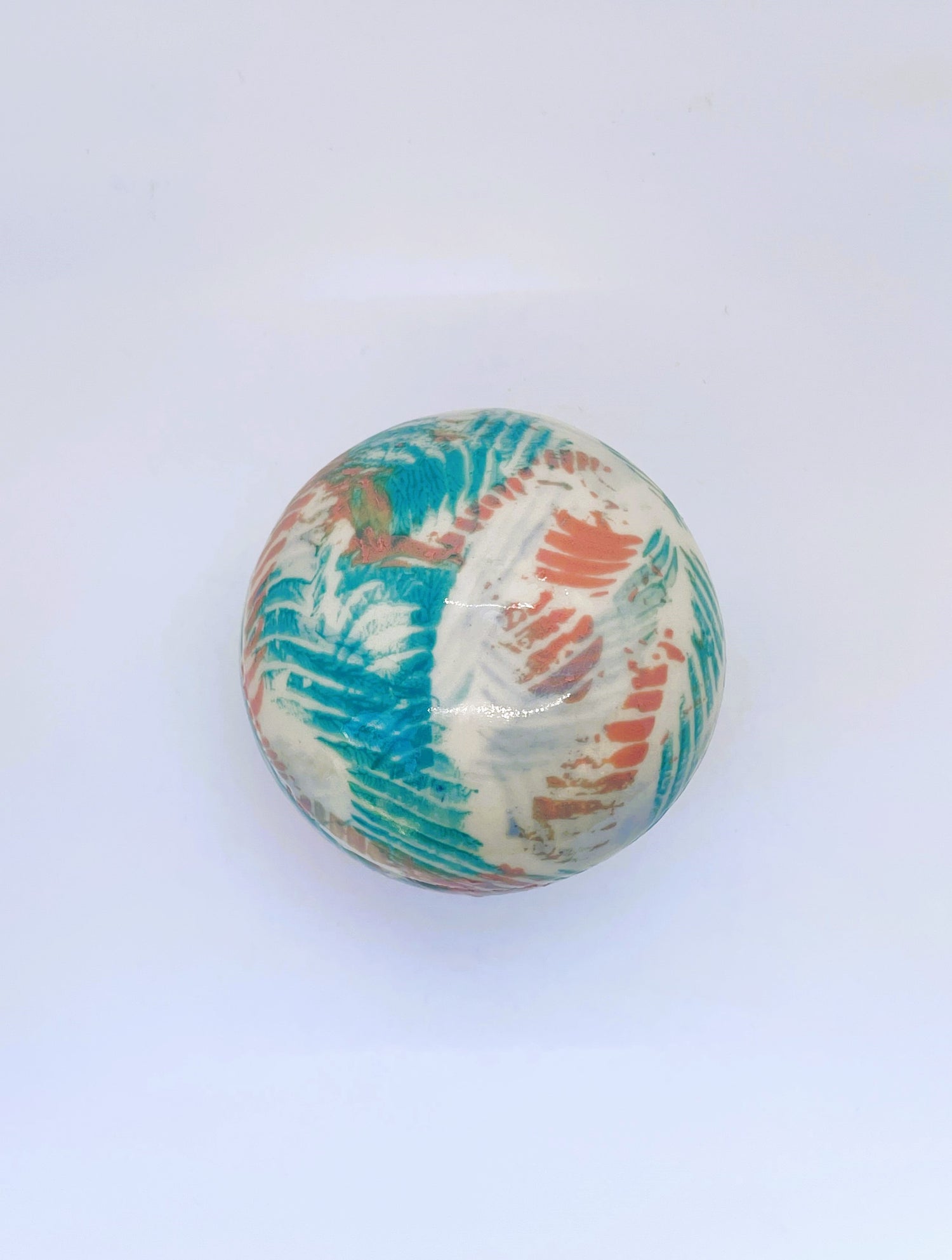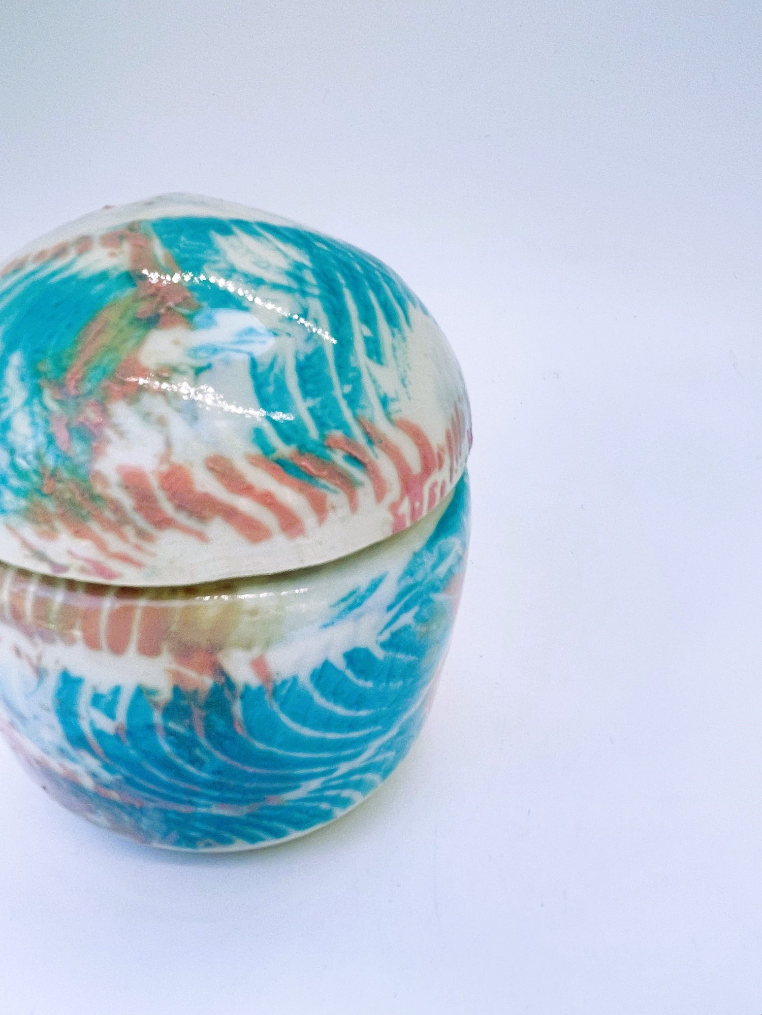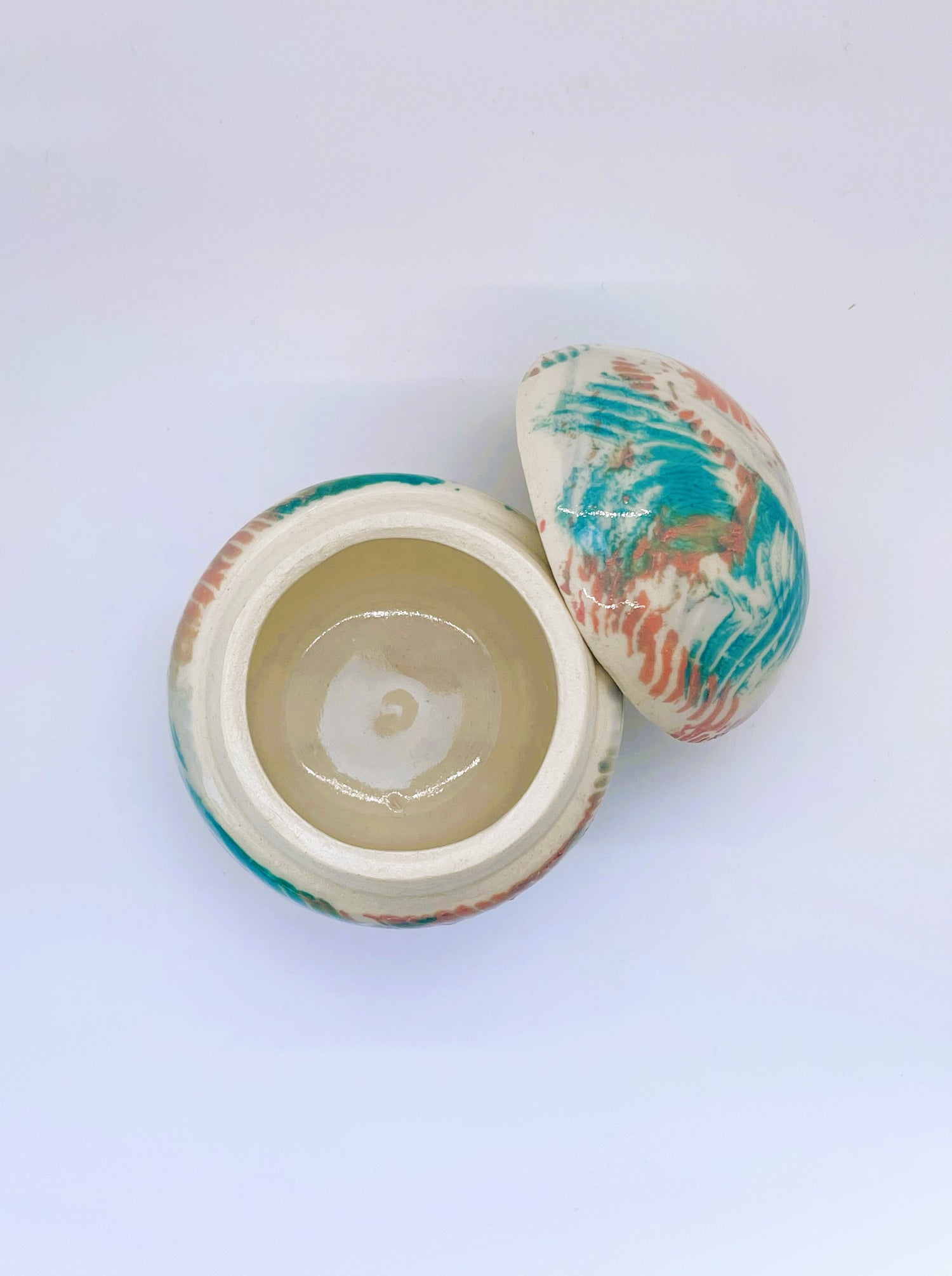 The organically abstract swathes of teal and coral shades feature on this striking but durable lidded container. Store jewelry, treasures or special foods, or enjoy it as a charming accent for display.Â