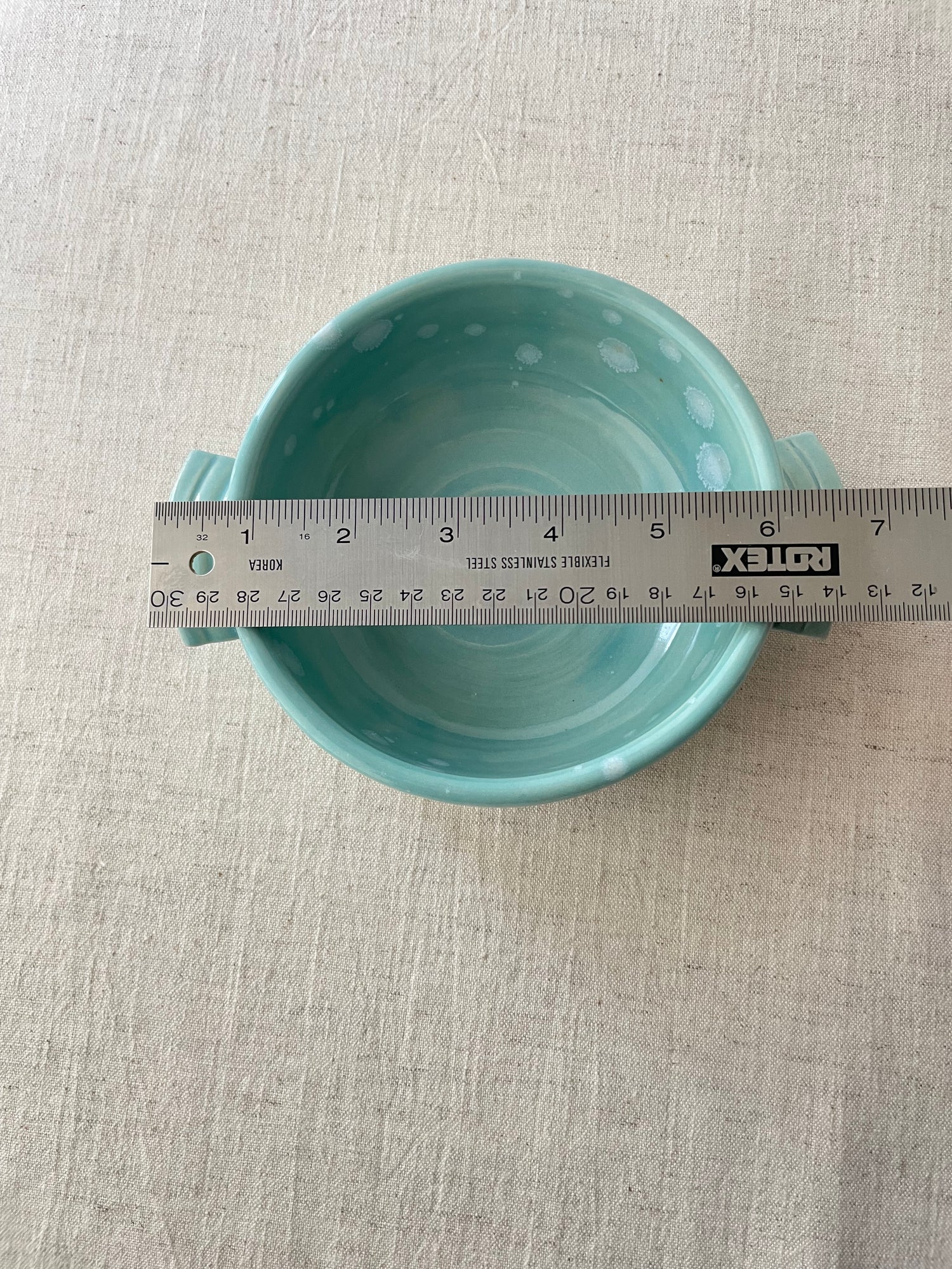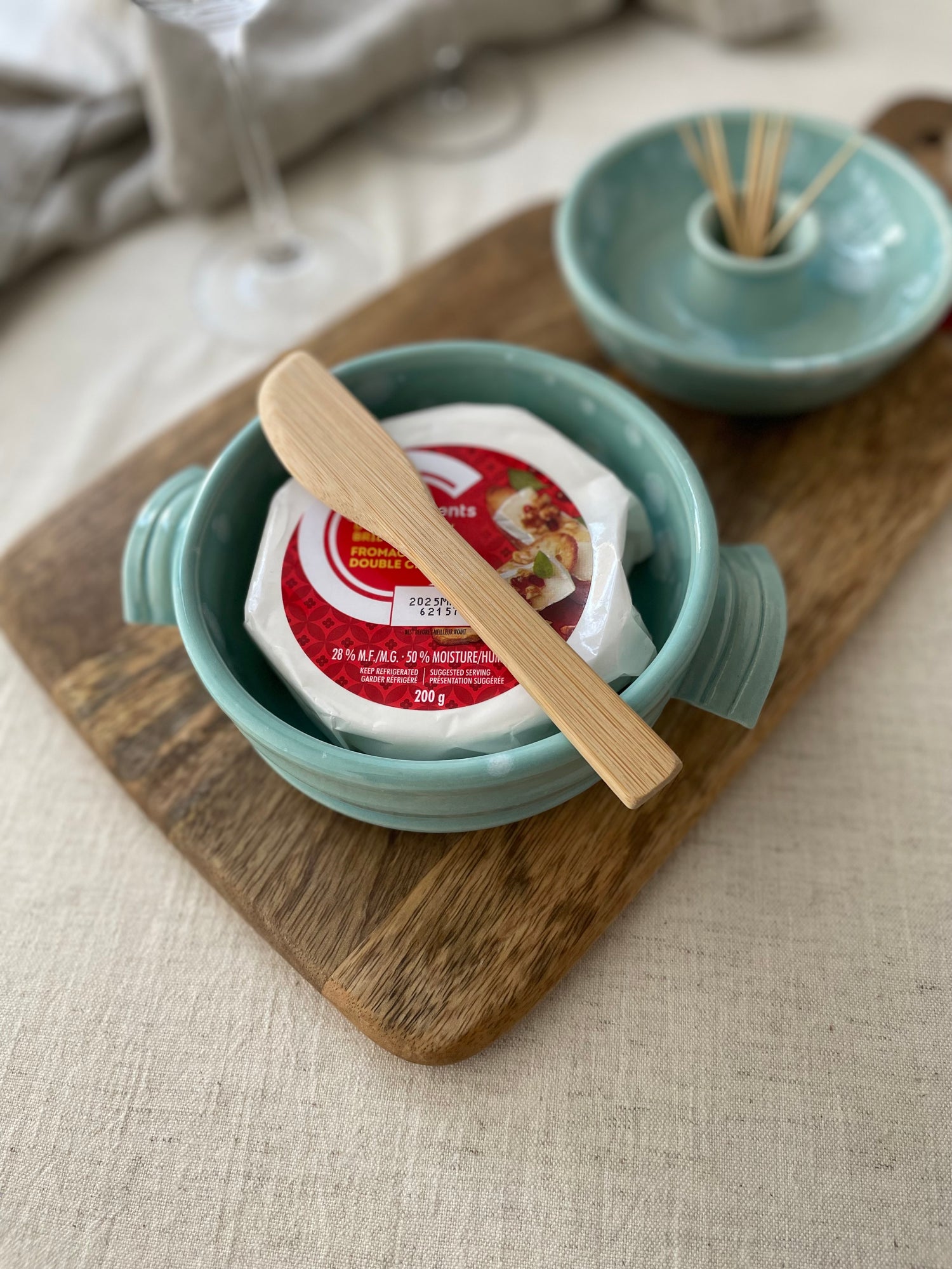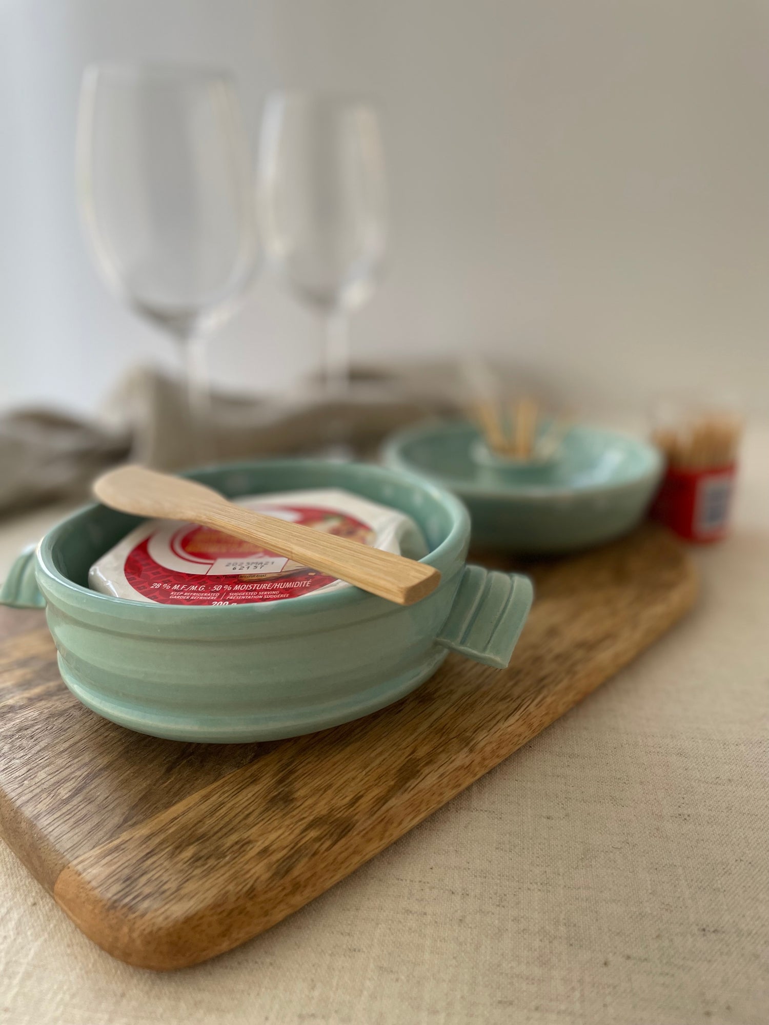 Translucent turquoise with bursts of delicate crystals makes an elegantly organic impact while being neutral enough to coordinate with a range of tableware styles. Use this versatile baker in the oven for baked brie and more. It doubles as a serving dish for nuts, candies or crackers, or heat chili-for-one in the microwave.