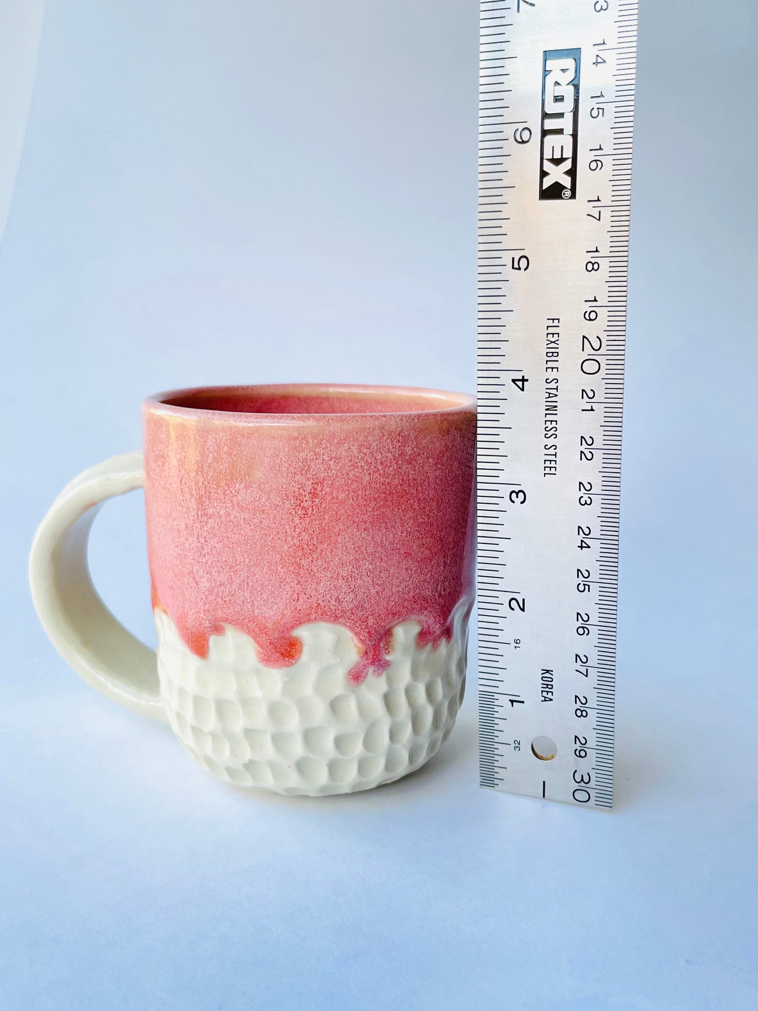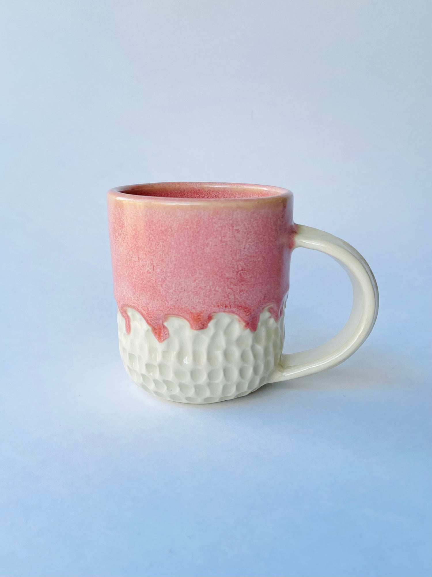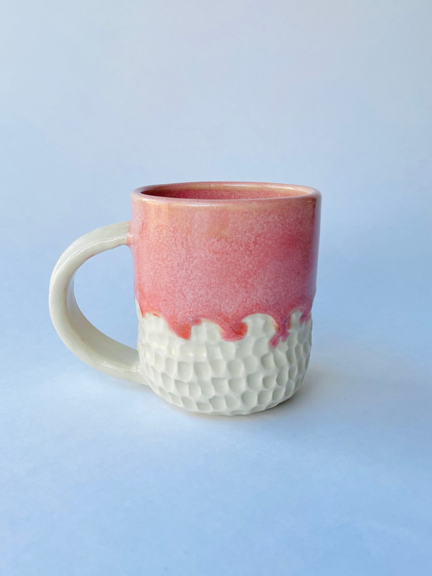 Fashionable textures and tones embellish this eye-catching mug. I hand carved the lower two-fifths of the exterior up to a scalloped edge. Once bisque fired, I glazed the mug by overlapping two pink glazes that create a rich coral base with a warm pale-pink variegation over the surface for a effect that's both bold and feminine. This mug holds 8 oz.