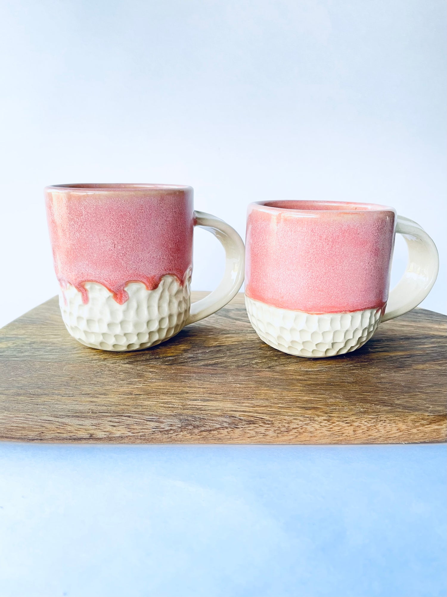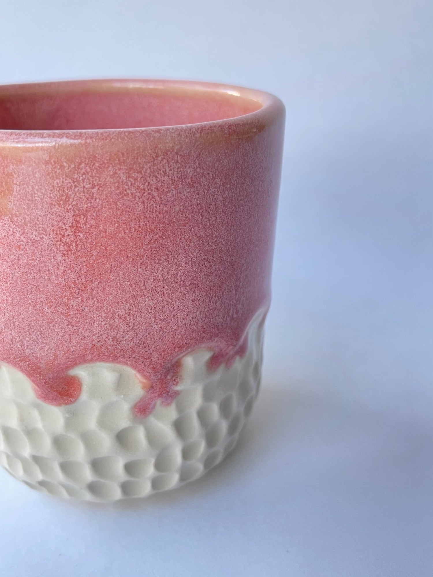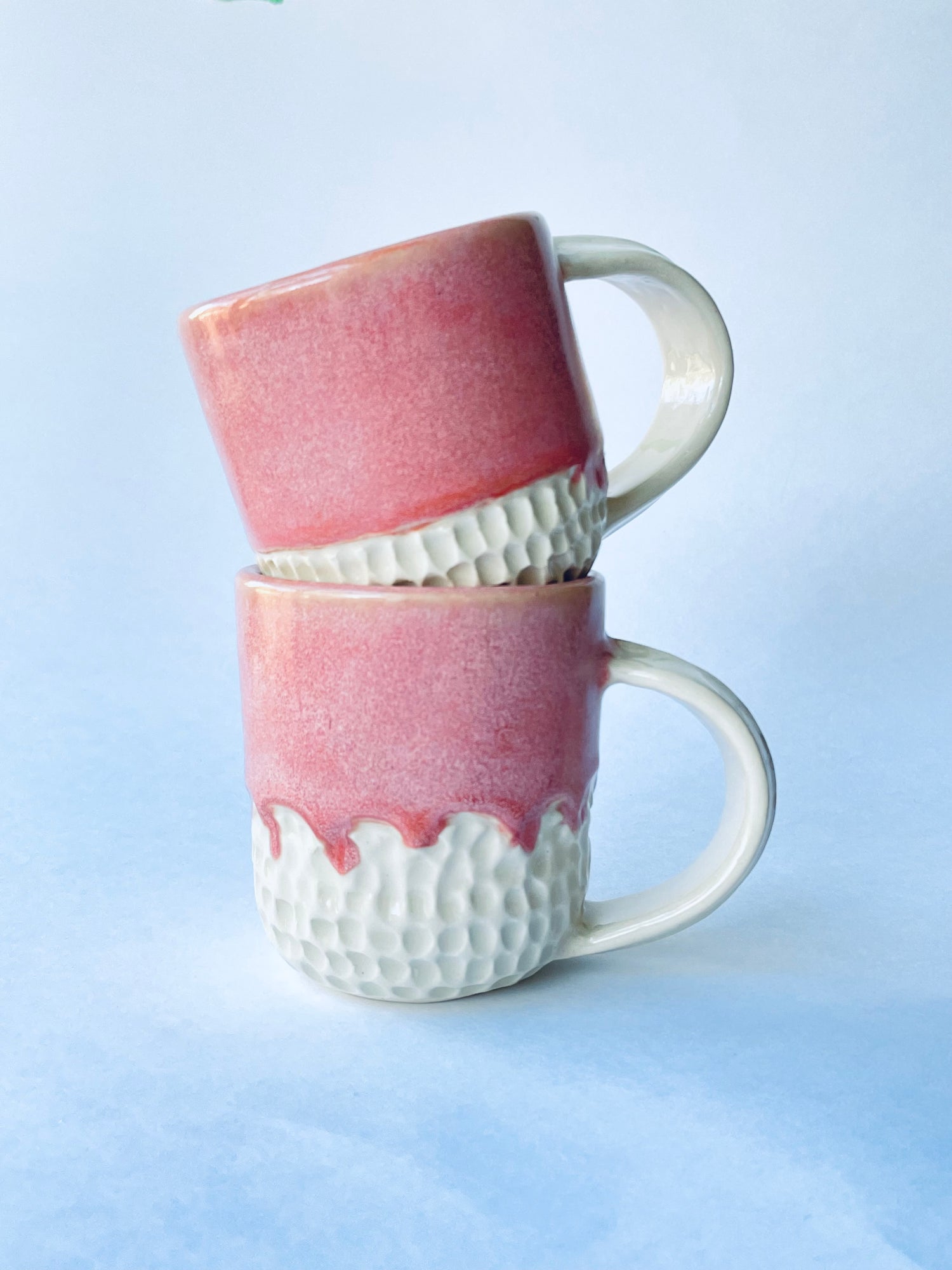Fashionable textures and tones embellish this eye-catching mug. I hand carved the lower two-fifths of the exterior up to a scalloped edge. Once bisque fired, I glazed the mug by overlapping two pink glazes that create a rich coral base with a warm pale-pink variegation over the surface for a effect that's both bold and feminine. This mug holds 8 oz.