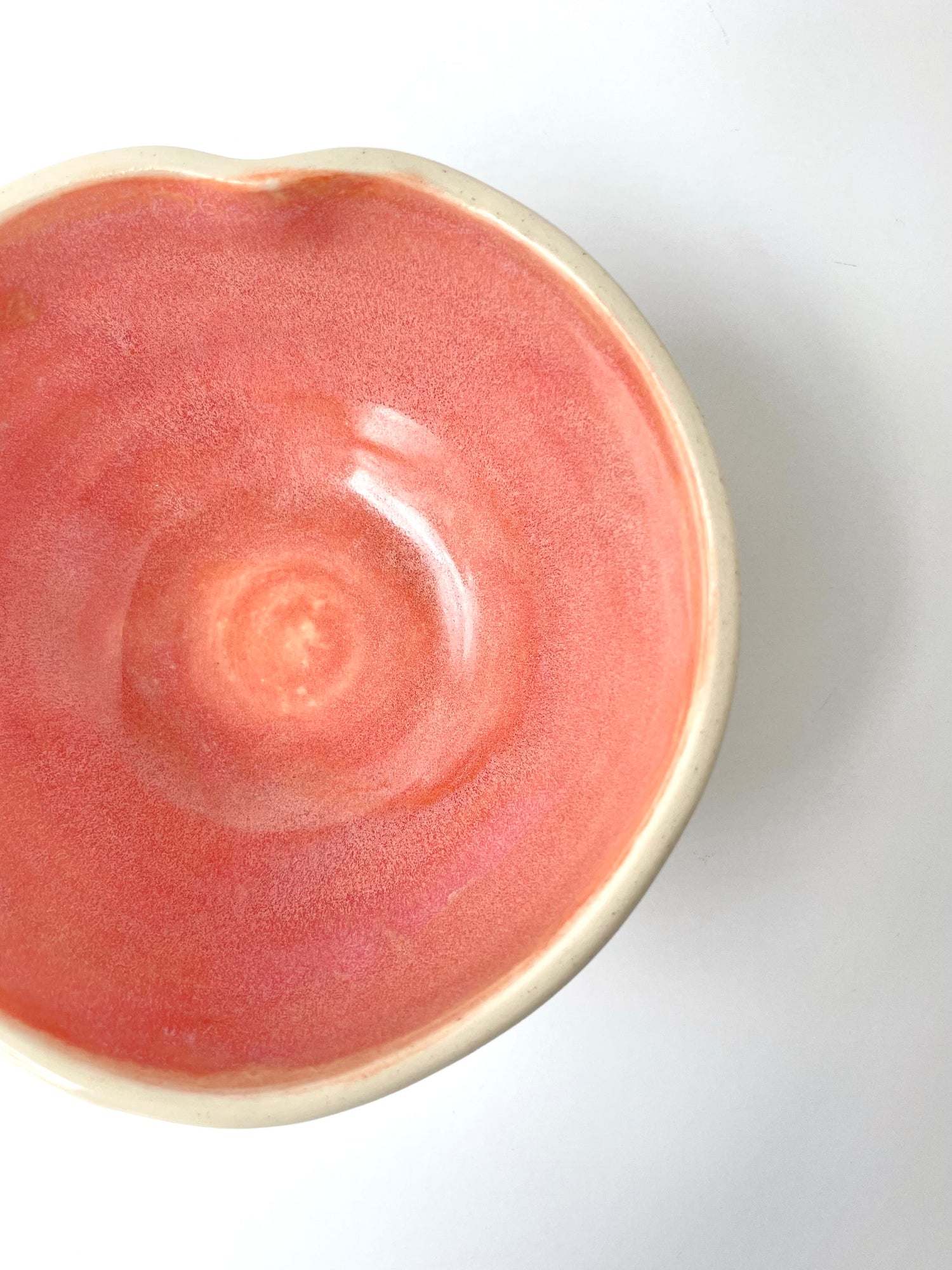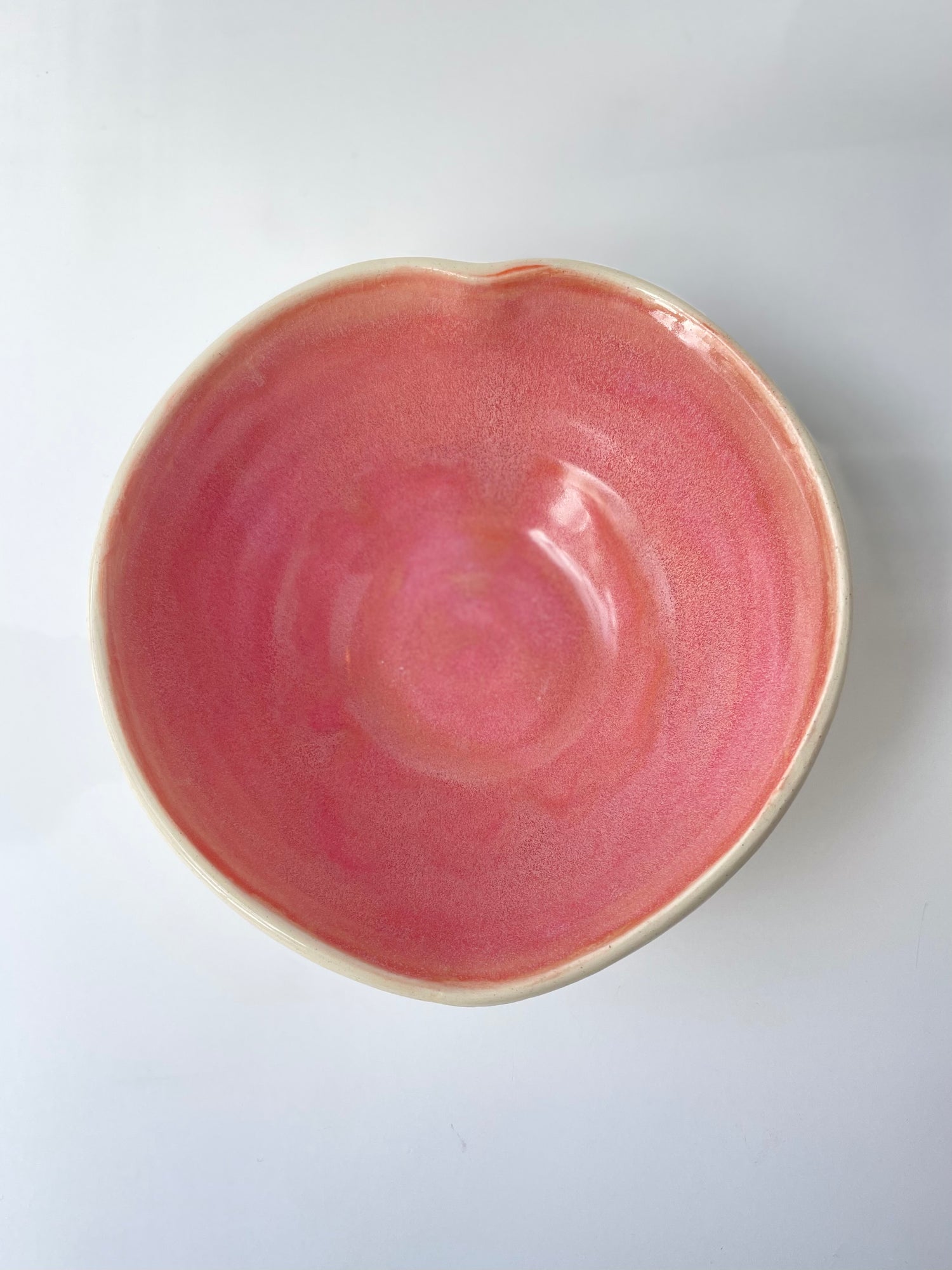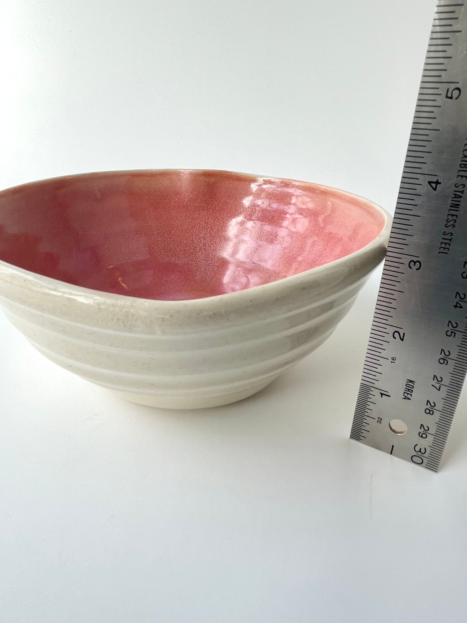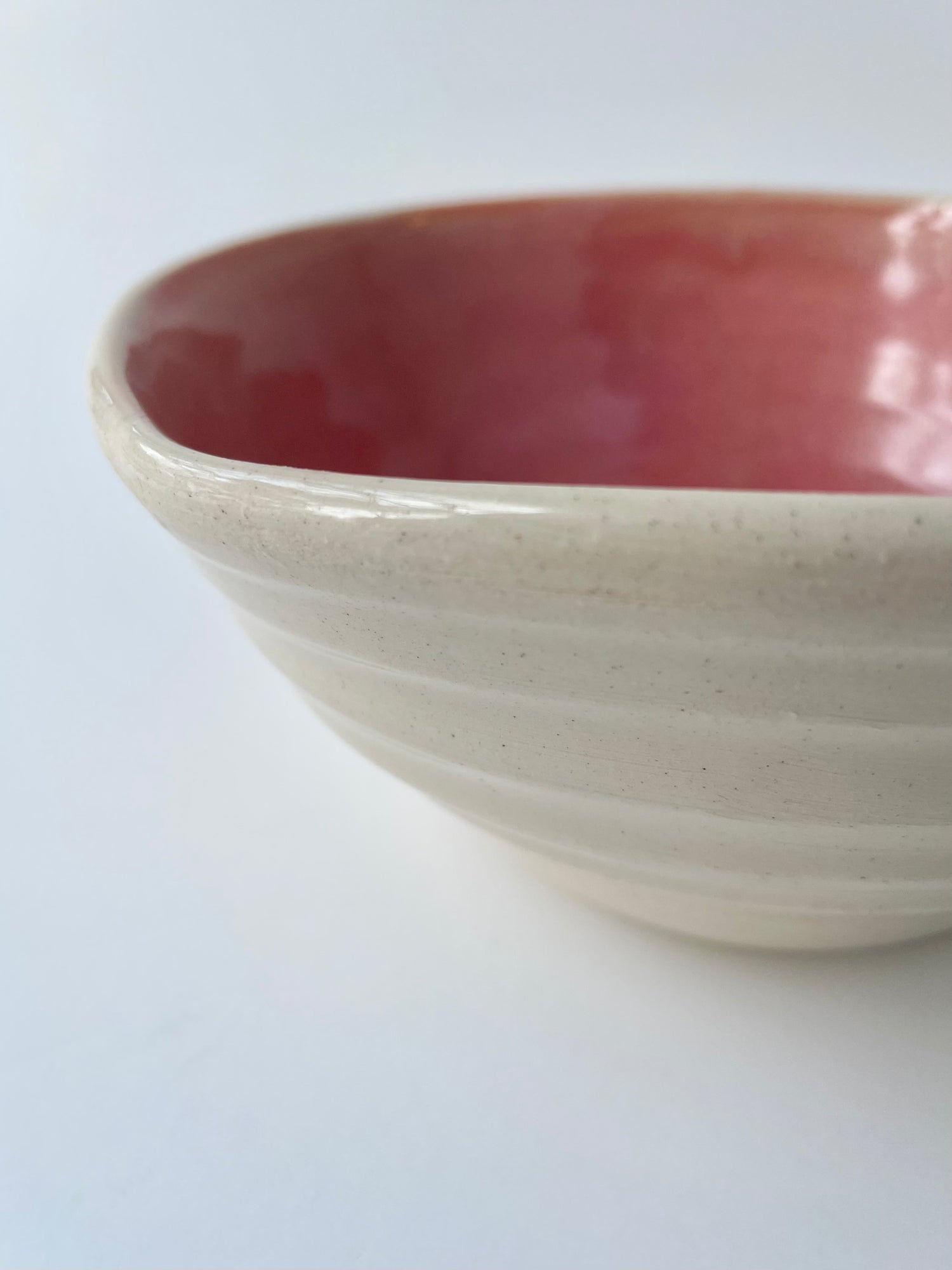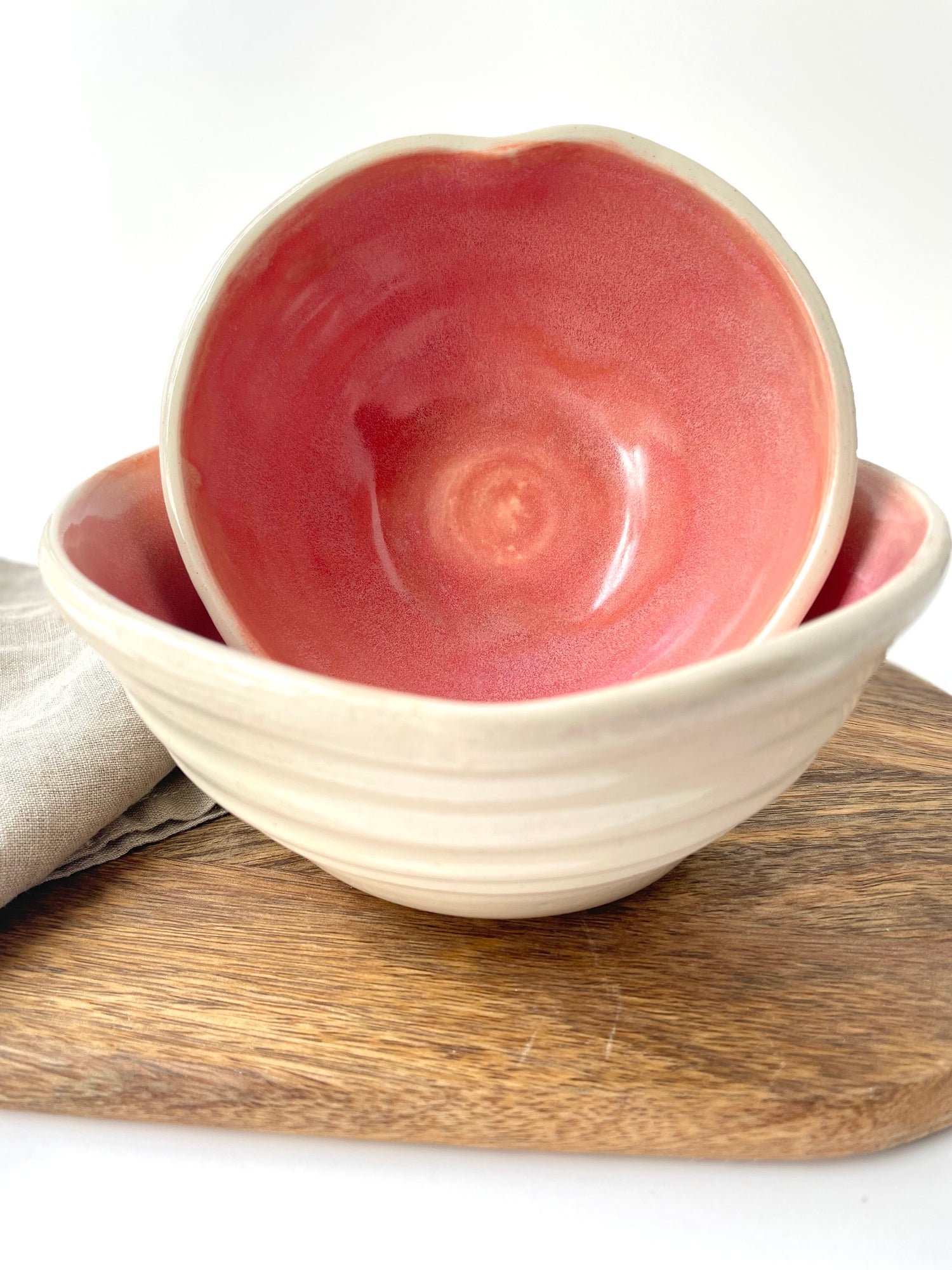The wheel-thrown bowls are textured and altered in shape after taking them off the wheel. A beautifully mottled warm pink glaze is hand-painted on the interior with a clear glaze on the outside for fresh appeal.