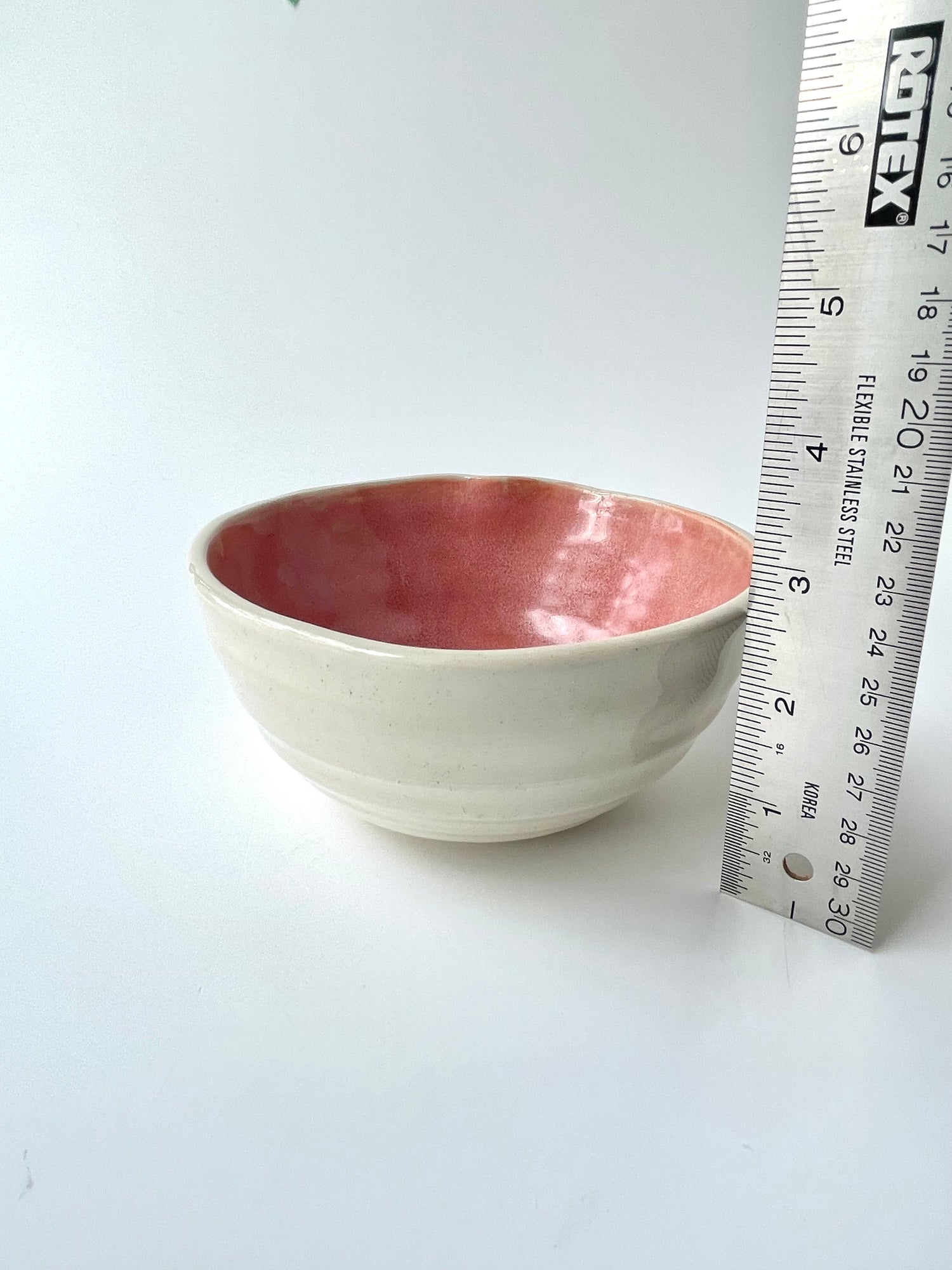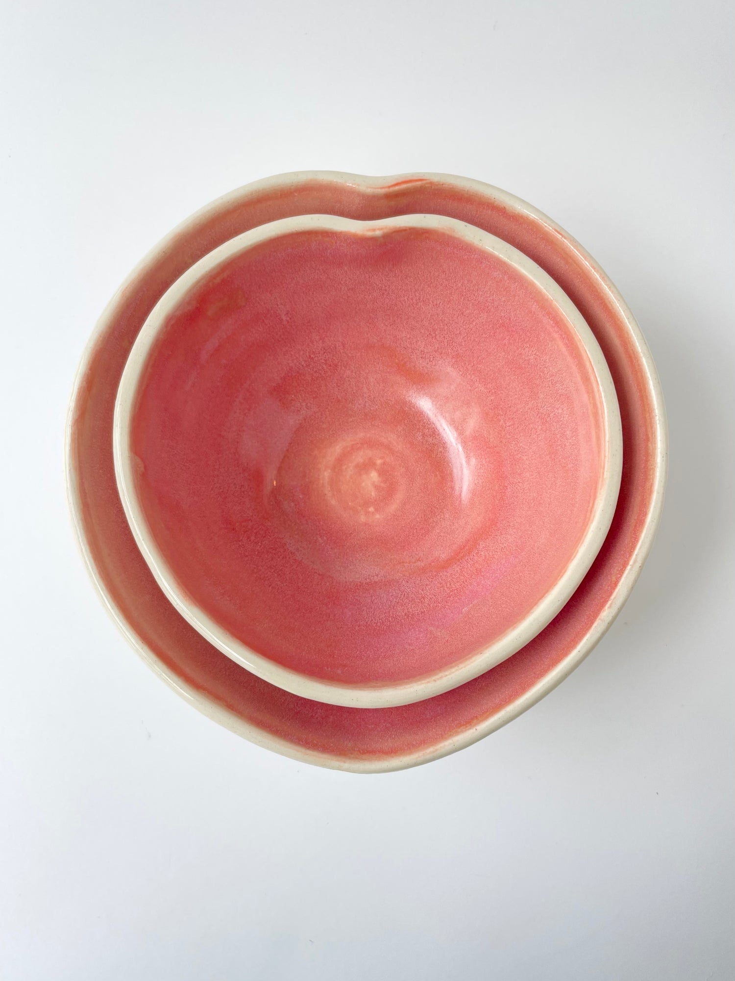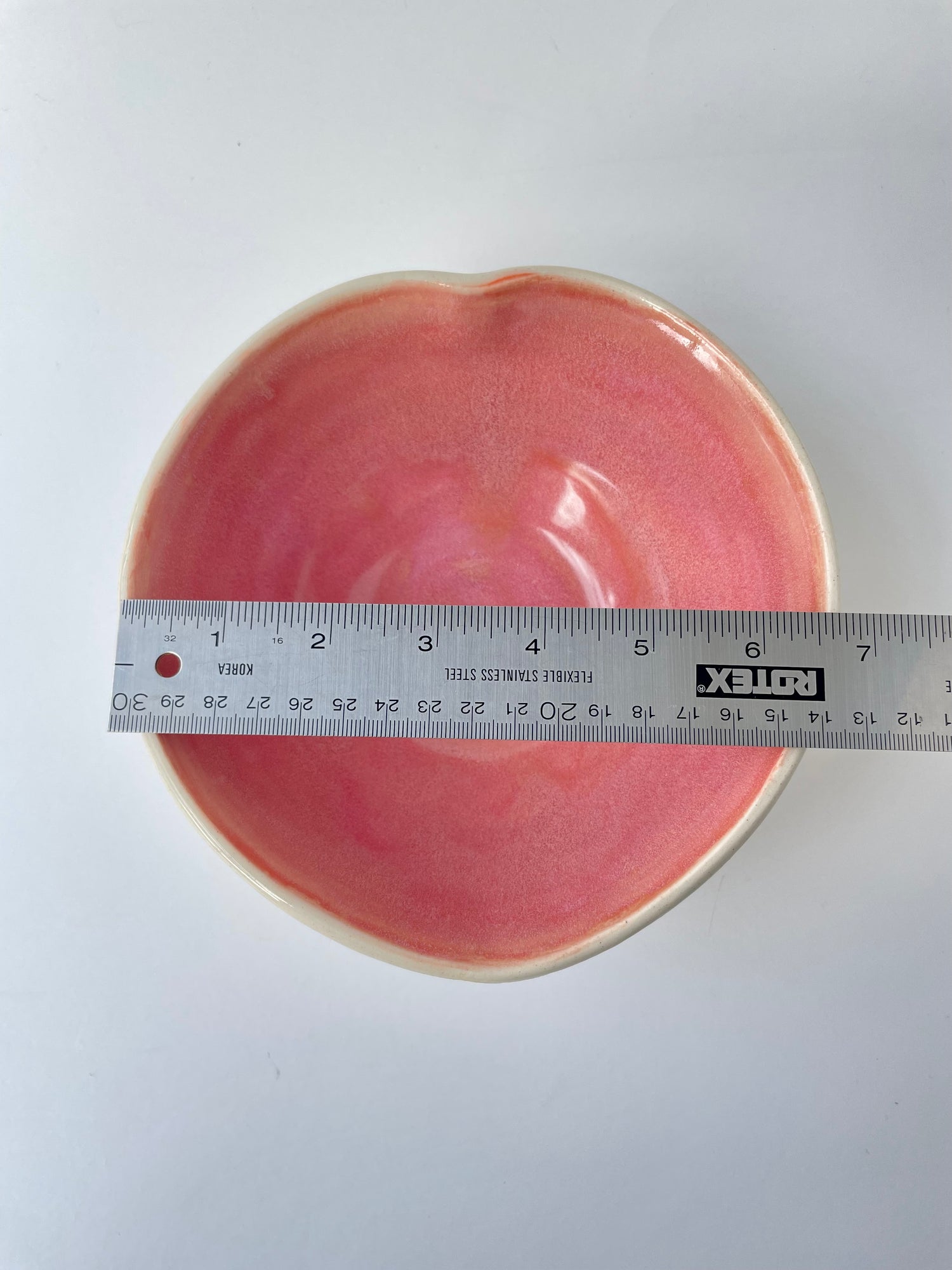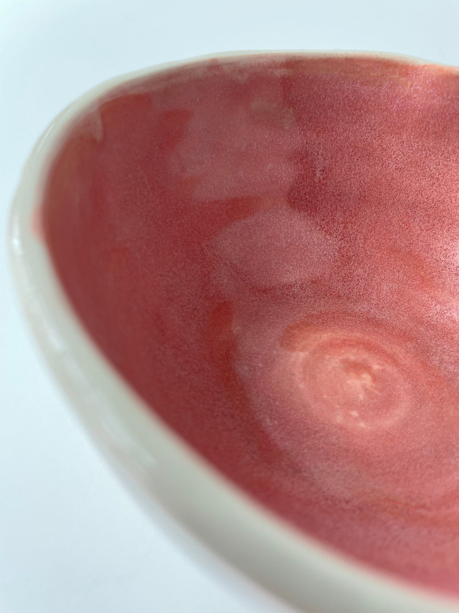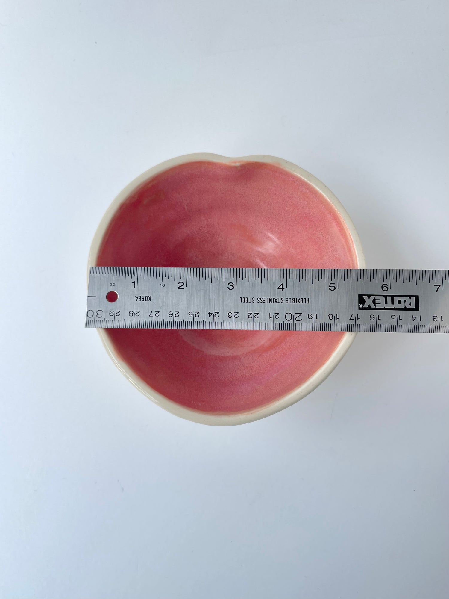 The wheel-thrown bowls are textured and altered in shape after taking them off the wheel. A beautifully mottled warm pink glaze is hand-painted on the interior with a clear glaze on the outside for fresh appeal.