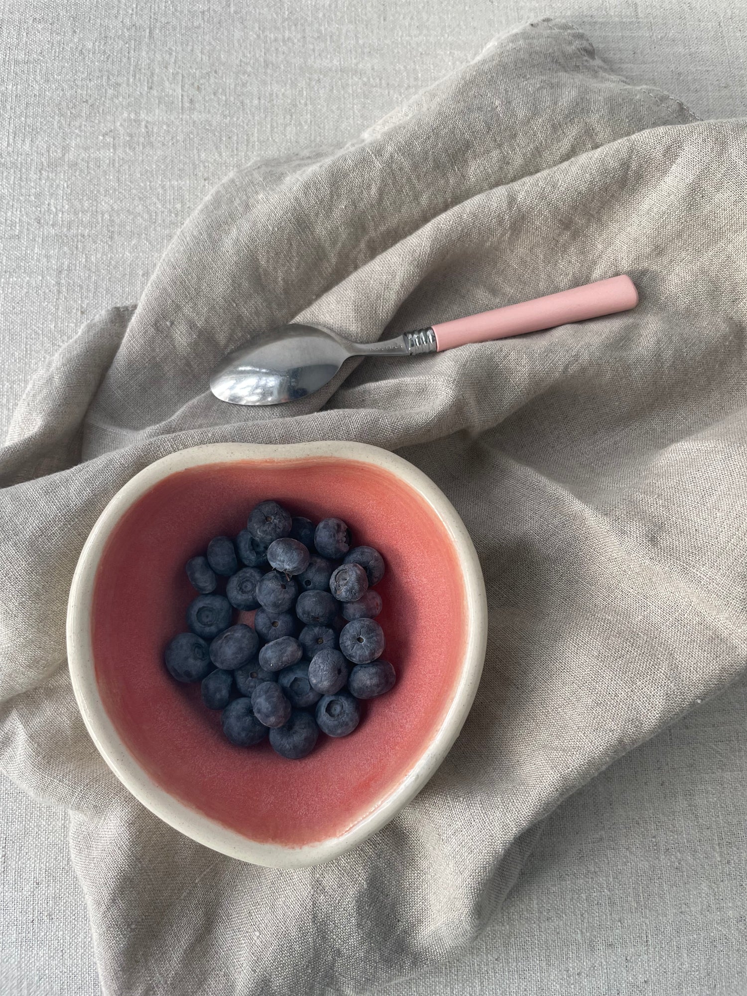 The wheel-thrown bowl was textured and altered in shape after taking it off the wheel. A beautifully mottled warm pink glaze is hand-painted on the interior with a clear glaze on the outside for fresh appeal.