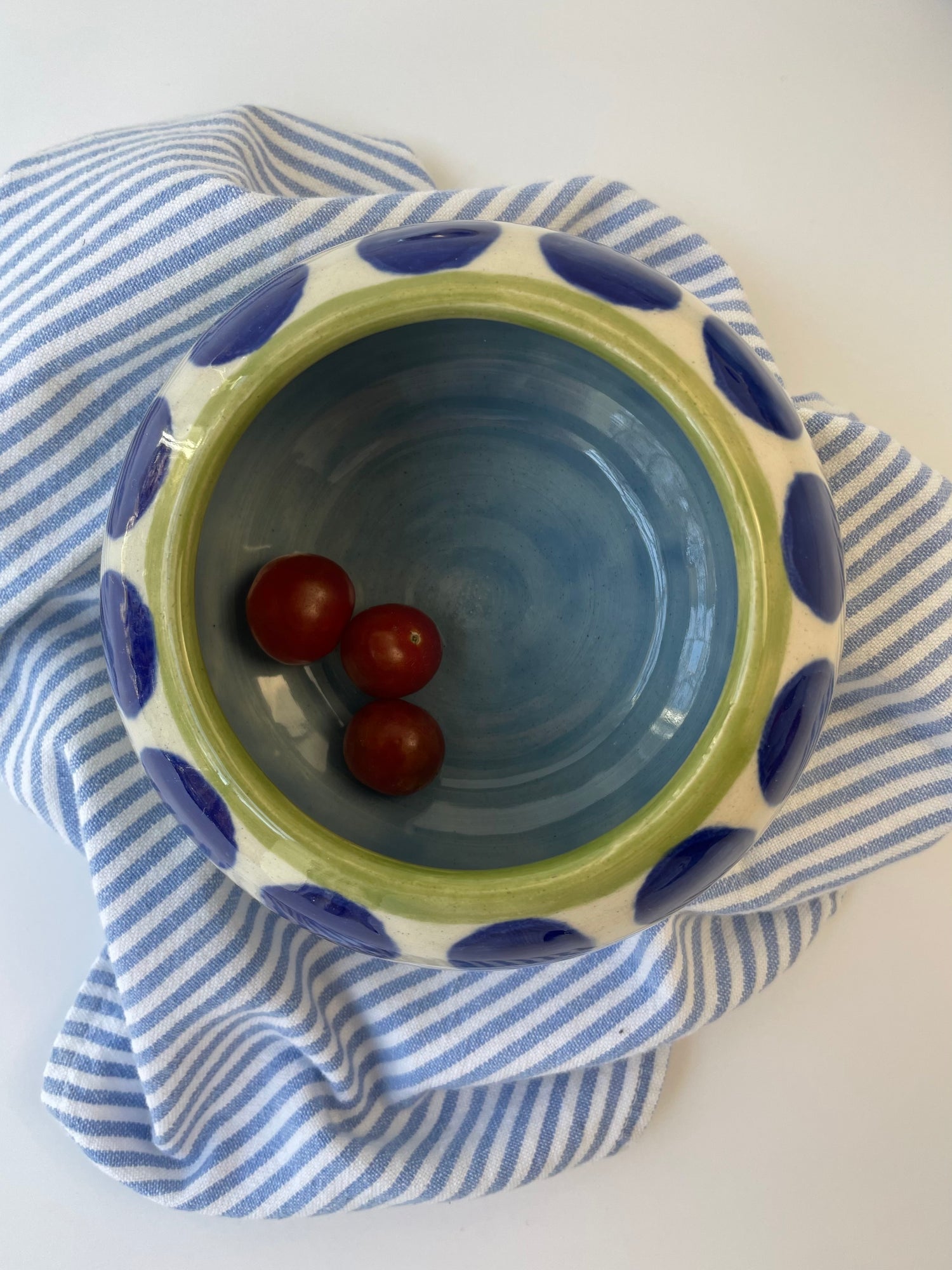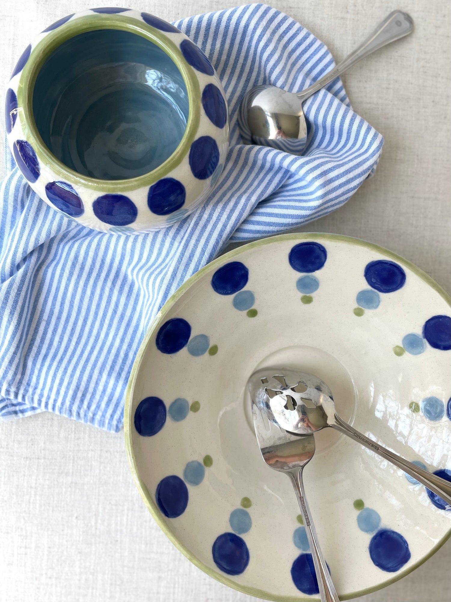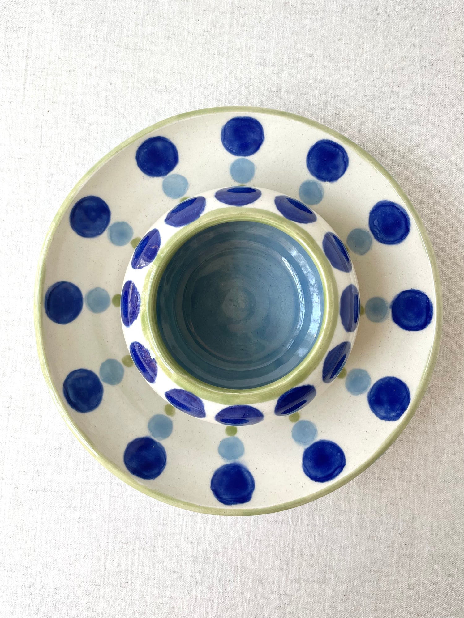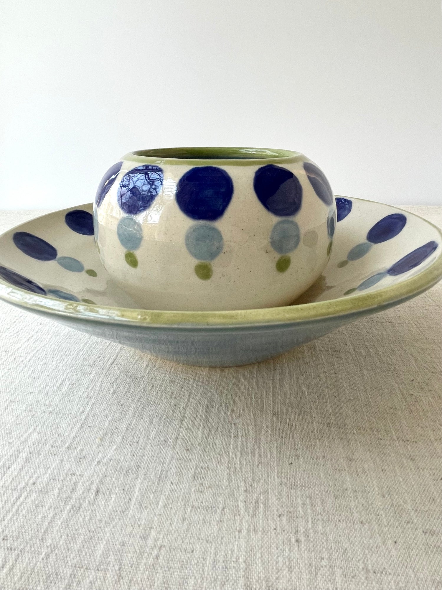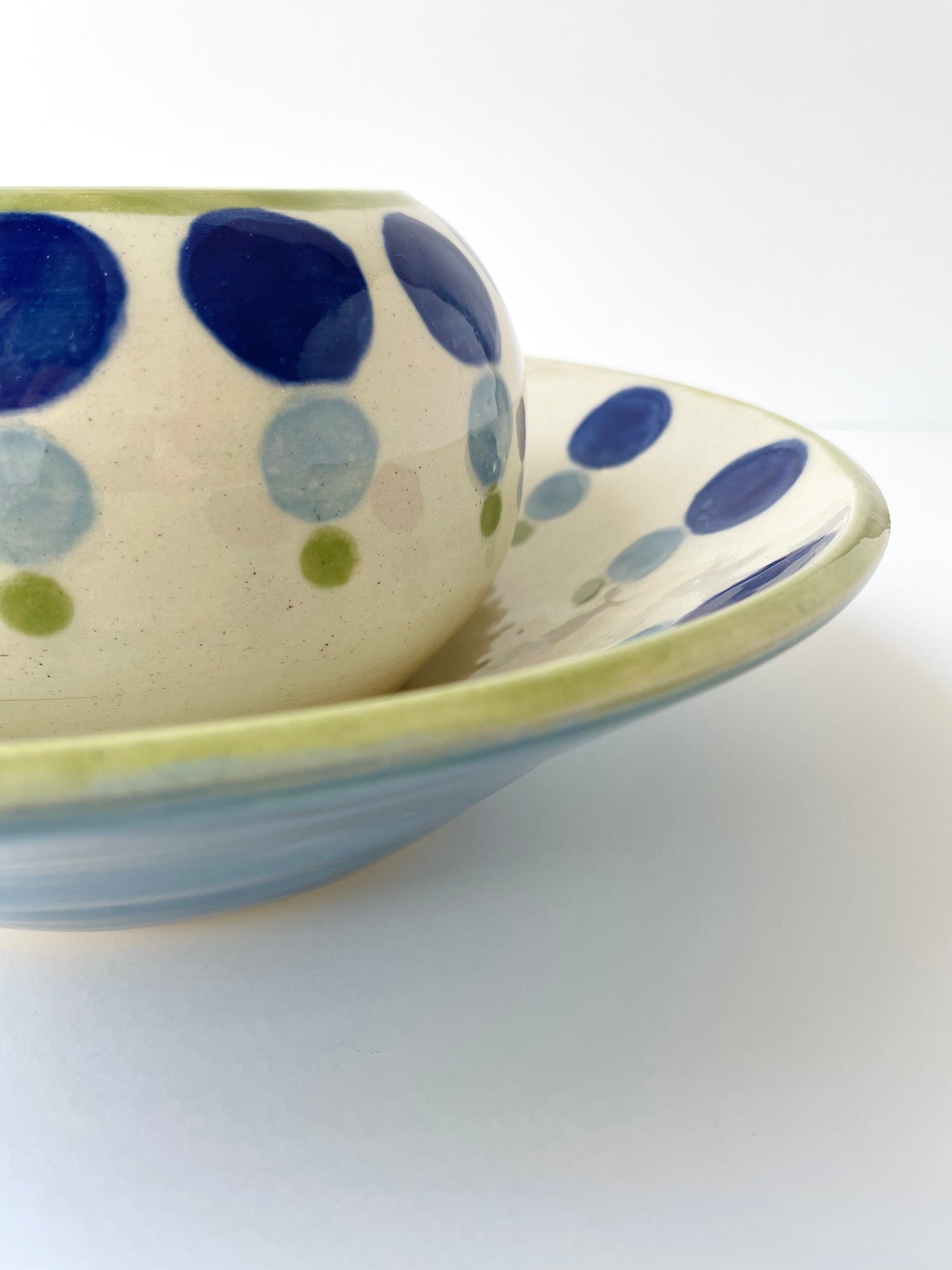 Both the bowl and the platter are wheel-thrown and are measured to nest together. I hand painted the dotty pattern with translucent glazes, and echoed the tones in the bowl and the platter's rim. The set makes a unique wedding gift, special occasion item or an indulgence for you and your future guests.