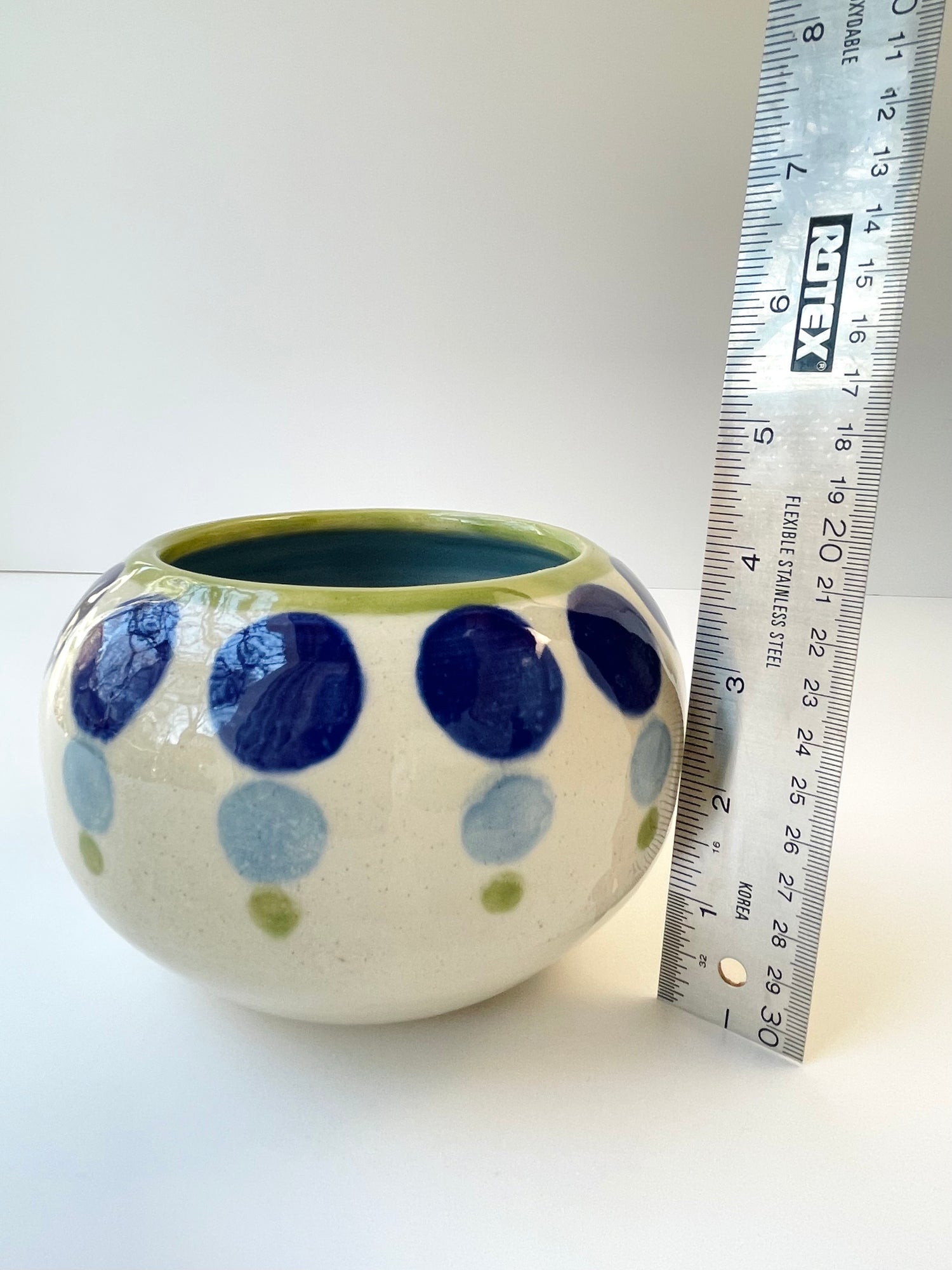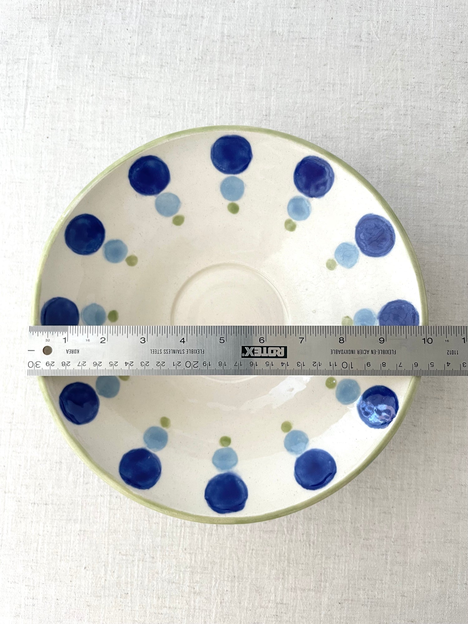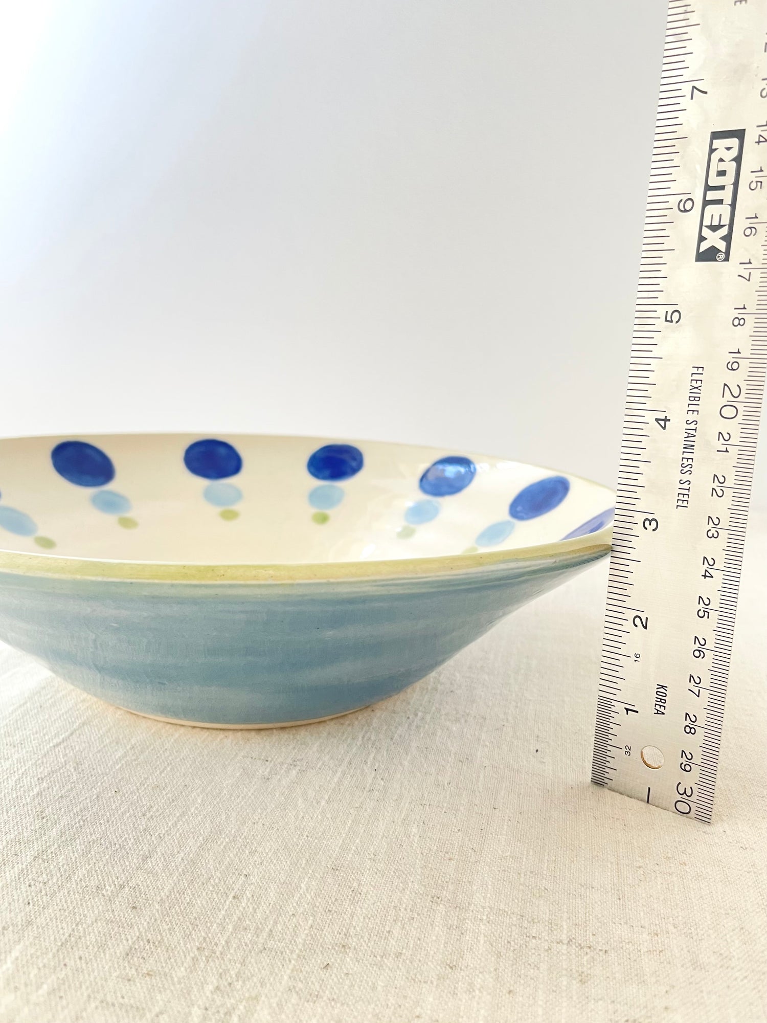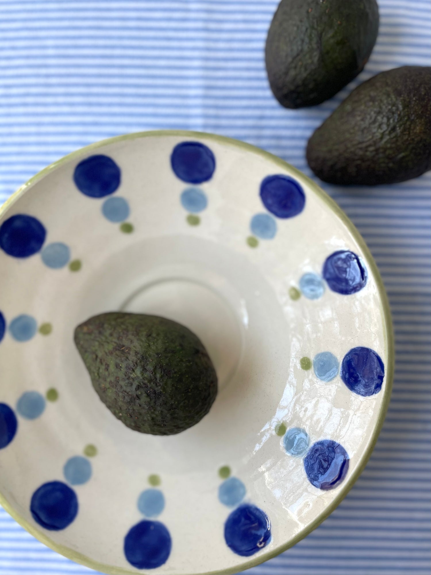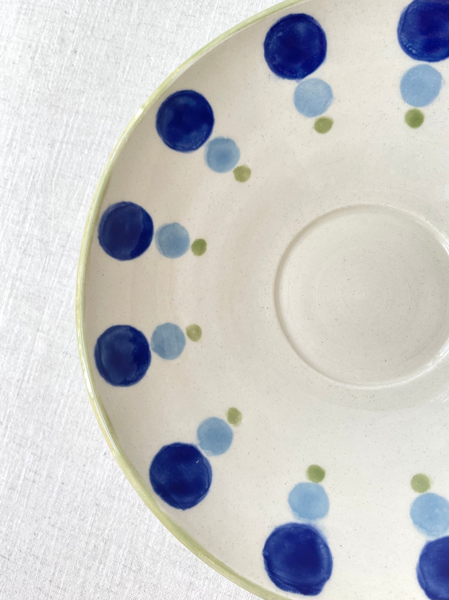 Both the bowl and the platter are wheel-thrown and are measured to nest together. I hand painted the dotty pattern with translucent glazes, and echoed the tones in the bowl and the platter's rim. The set makes a unique wedding gift, special occasion item or an indulgence for you and your future guests.