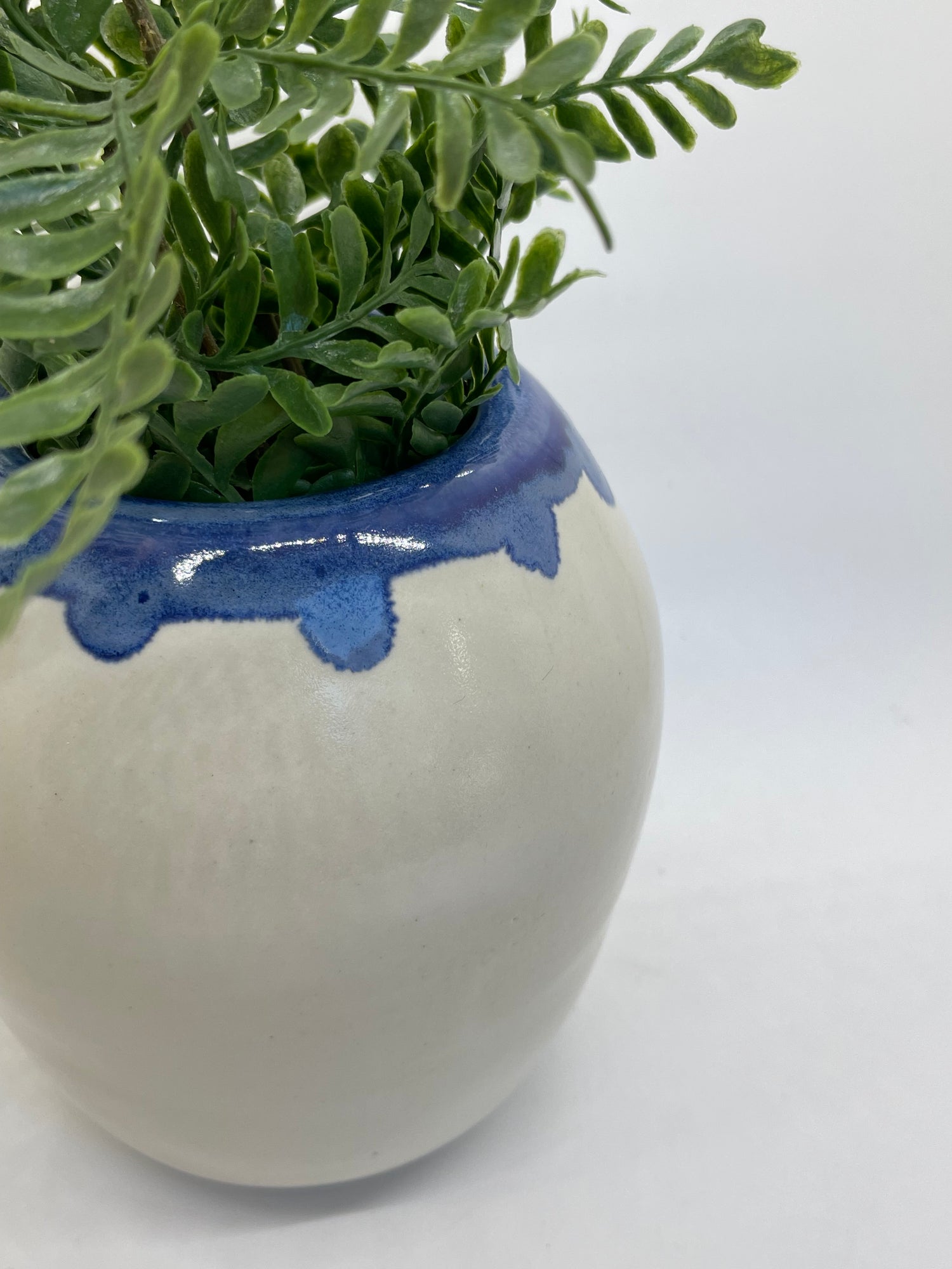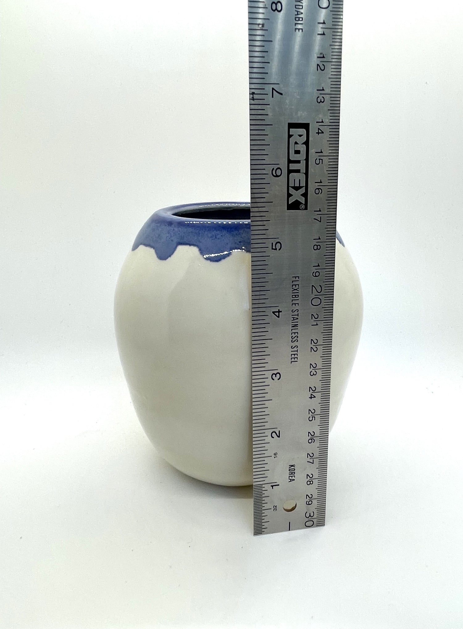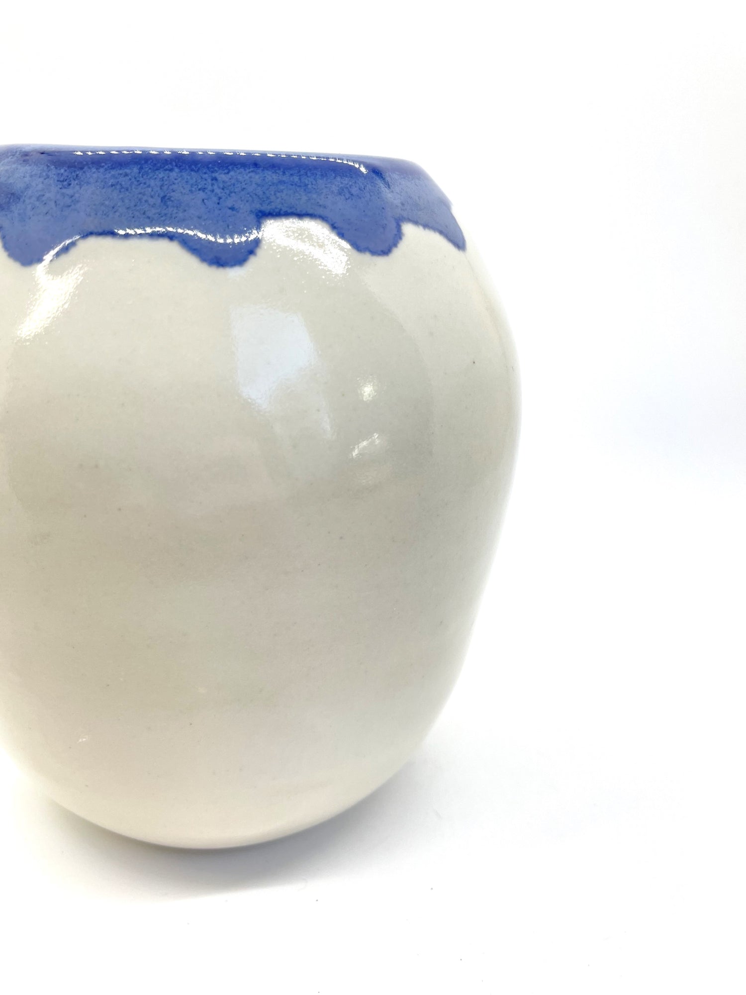 This white and blue ceramic vase makes a cheerful yet minimal accent piece that fits in modern interior design style, modern farmhouse decor and cottage style home decor. For this handmade ceramic vase, I threw the form on the wheel, painted the rim with the rich variegated blue glaze, and covered the entirety with a shiny clear glaze for durability and gloss.