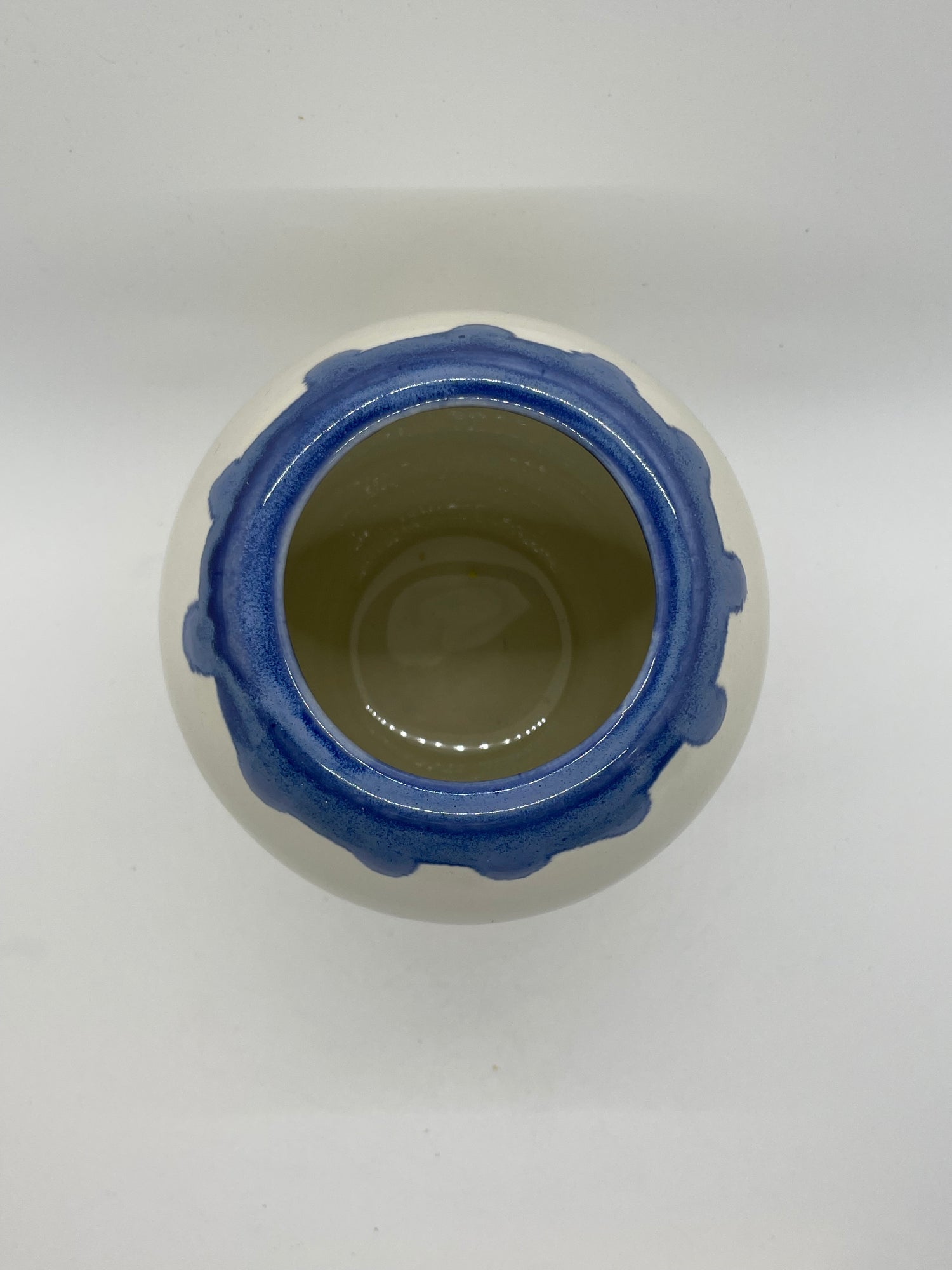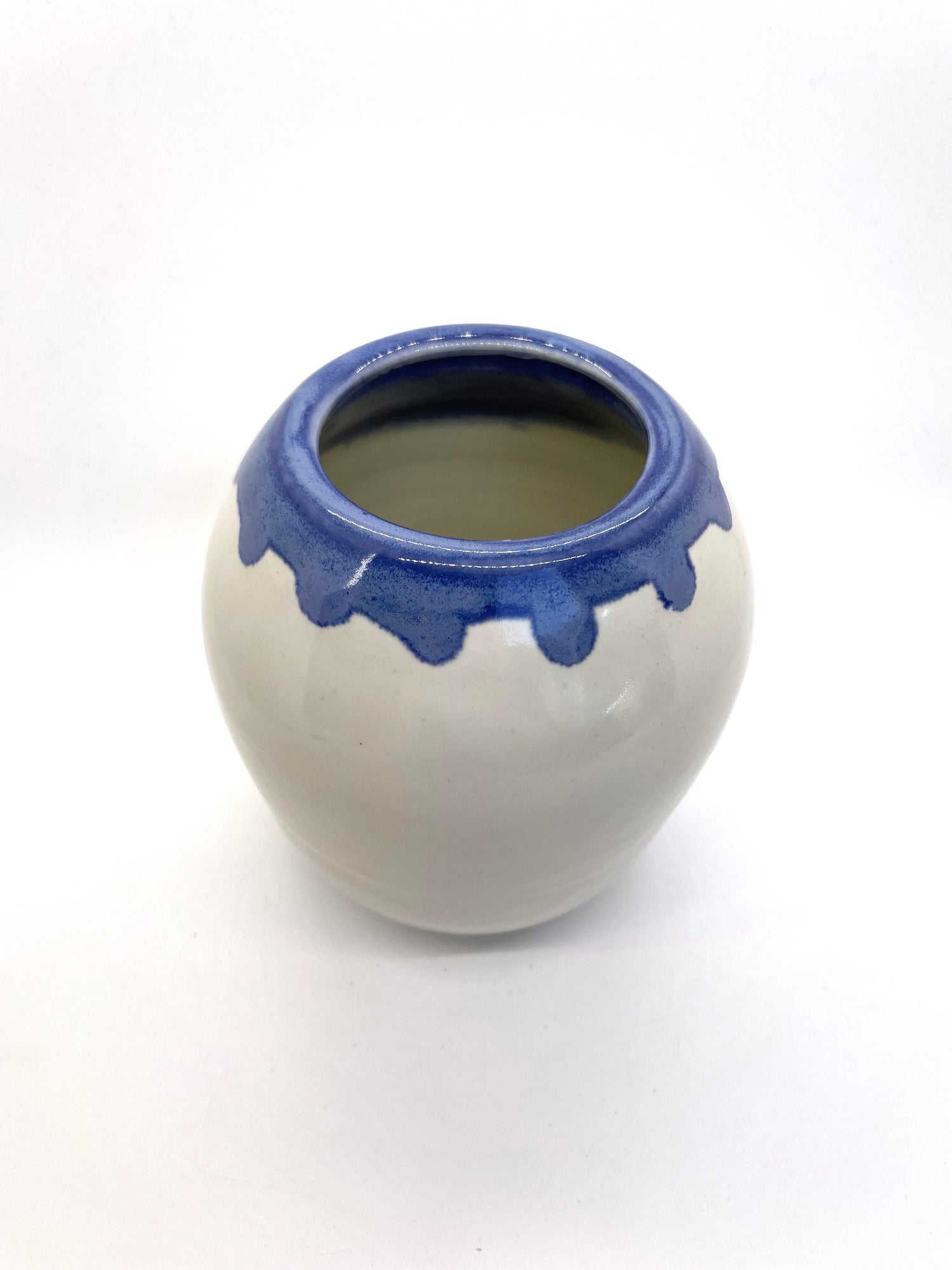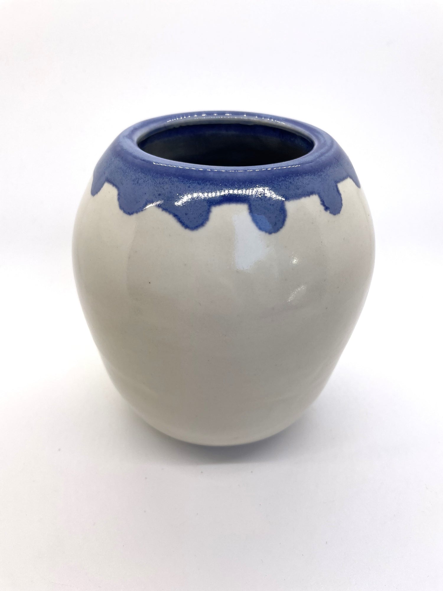 This white and blue ceramic vase makes a cheerful yet minimal accent piece that fits in modern interior design style, modern farmhouse decor and cottage style home decor. For this handmade ceramic vase, I threw the form on the wheel, painted the rim with the rich variegated blue glaze, and covered the entirety with a shiny clear glaze for durability and gloss.